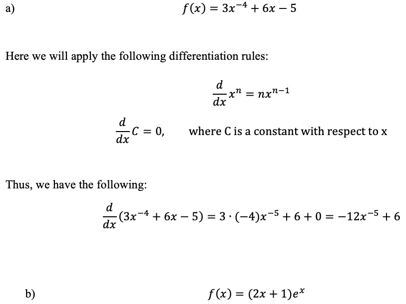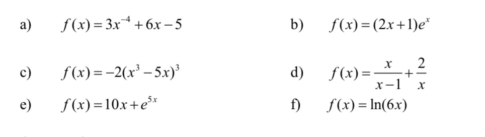 a) f(x)=3x*+6x-5 b) f(x)=(2x+1)e c) f(x)=-2(x3-5x)3 d) f(x)= xx...