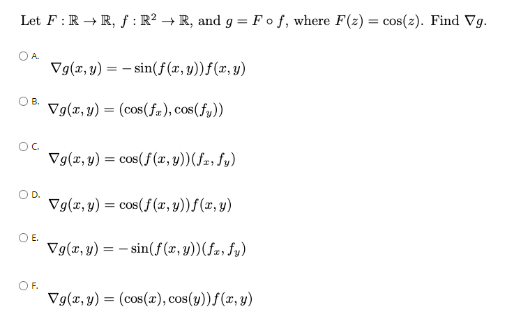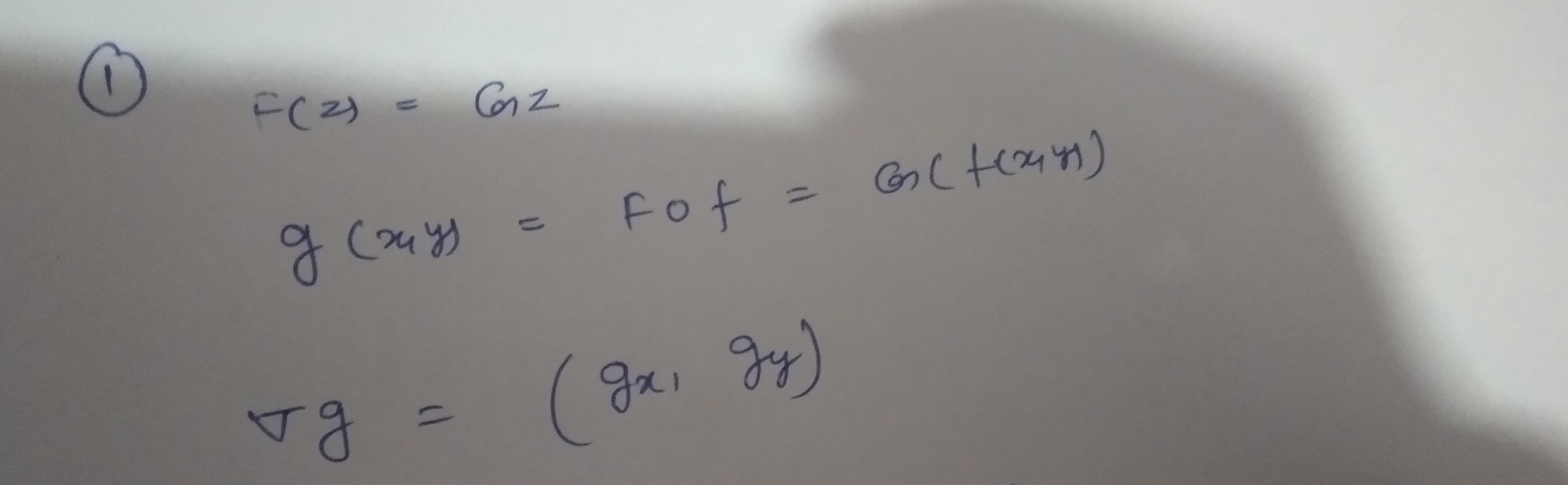Let F:R -> R, f : R2 - R, and g = Fof, where F(z) = cos(z). Find...