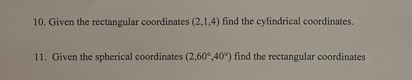 10. Given the rectangular coordinates (2,1,4) find the cylindrical...