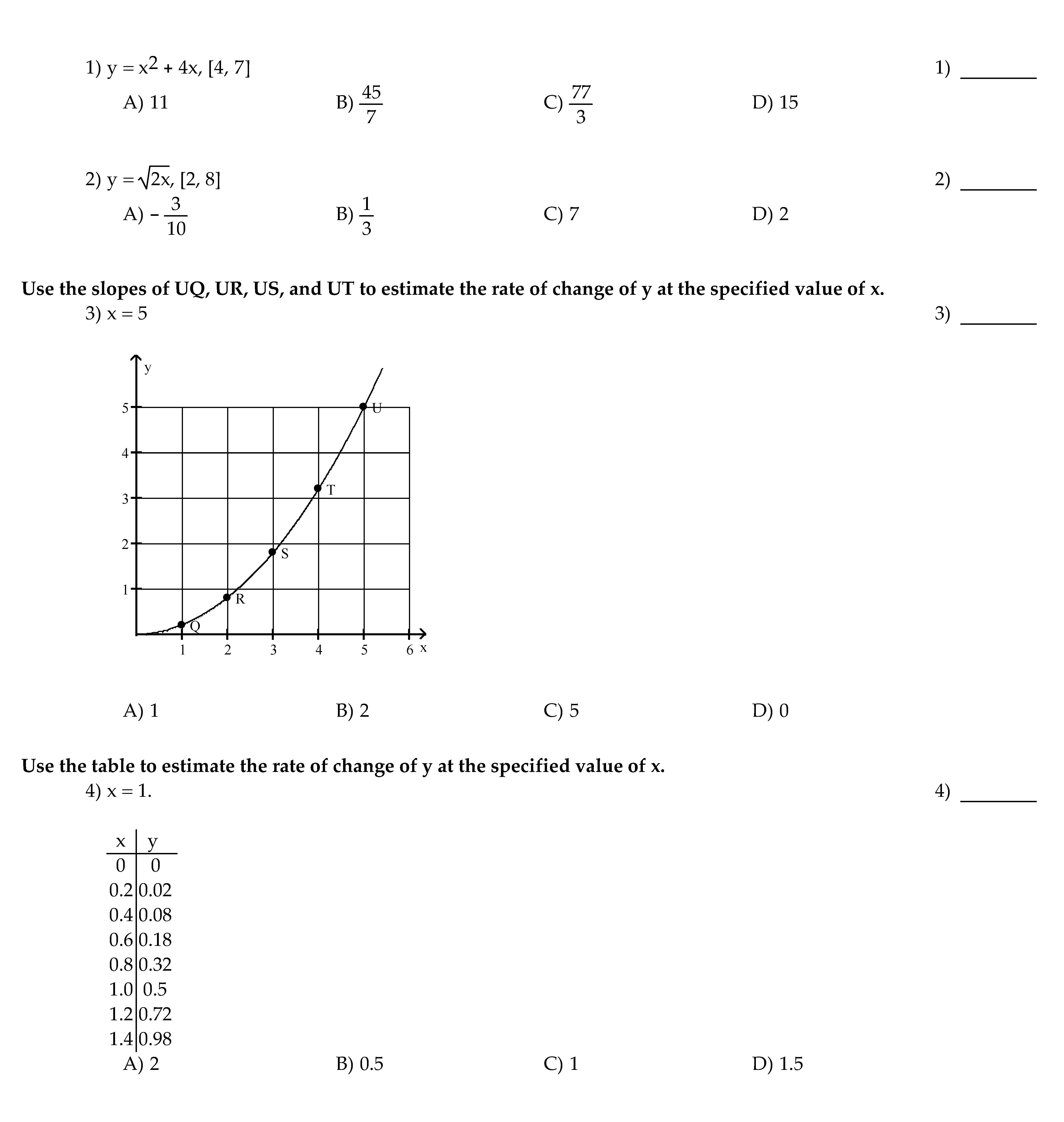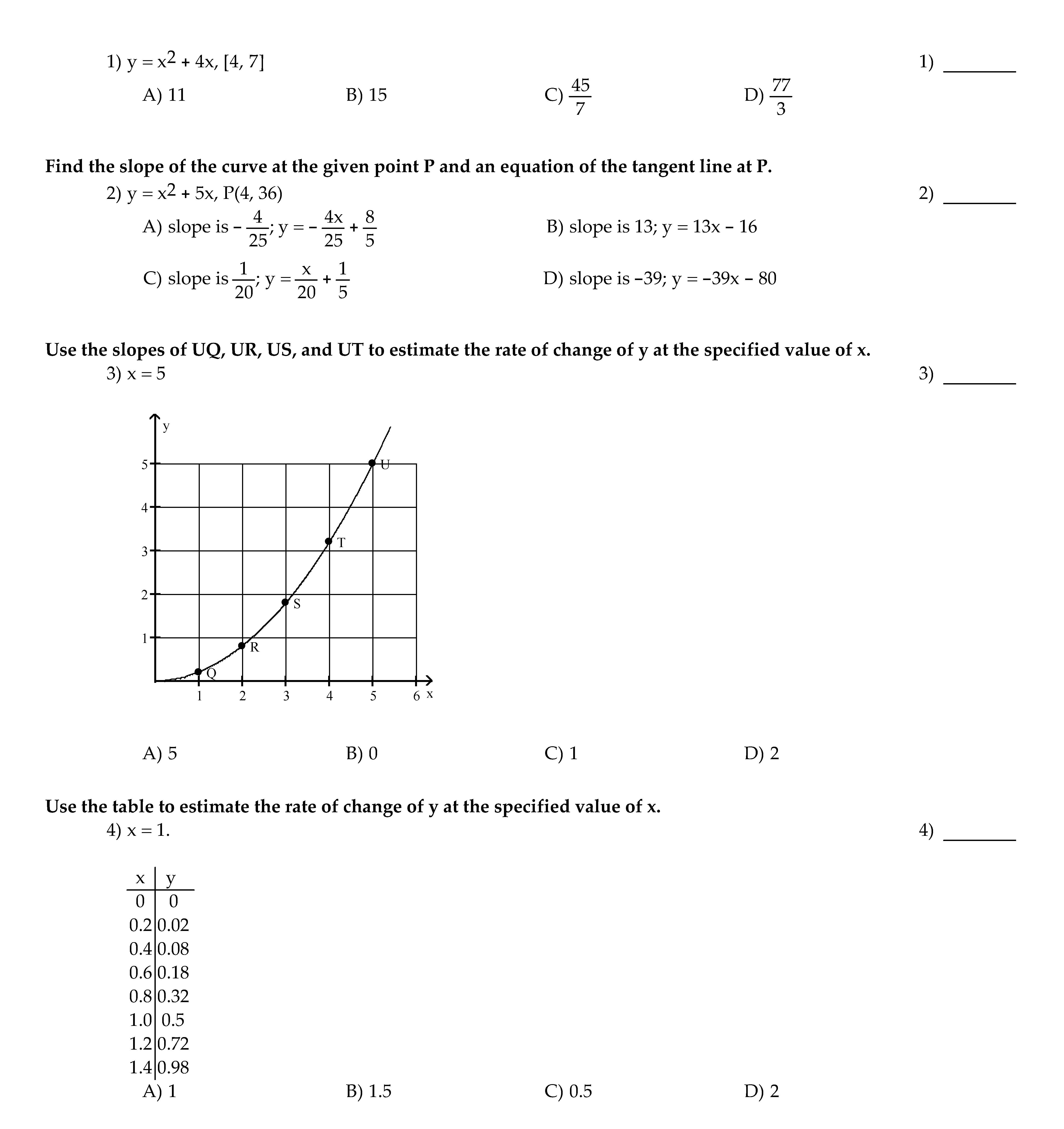 1) y = x2 + 4x, [4, 7] A) 11 B) 45 7 C) 77 3 D) 15 1) 2) y =...
