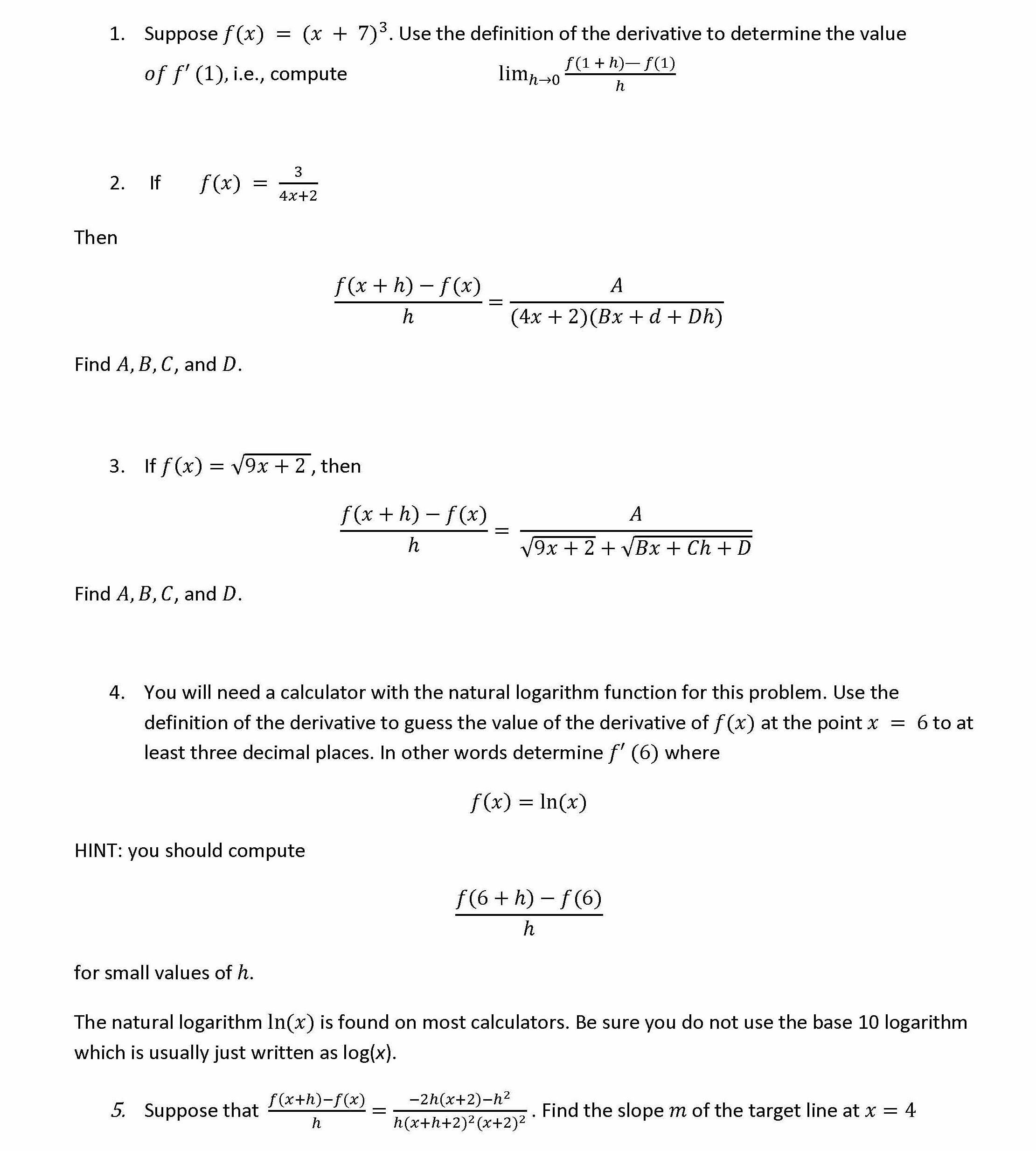 1. Suppose ð‘“(ð‘¥) = (ð‘¥ + 7)3. Use the definition of the deri...