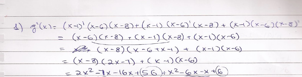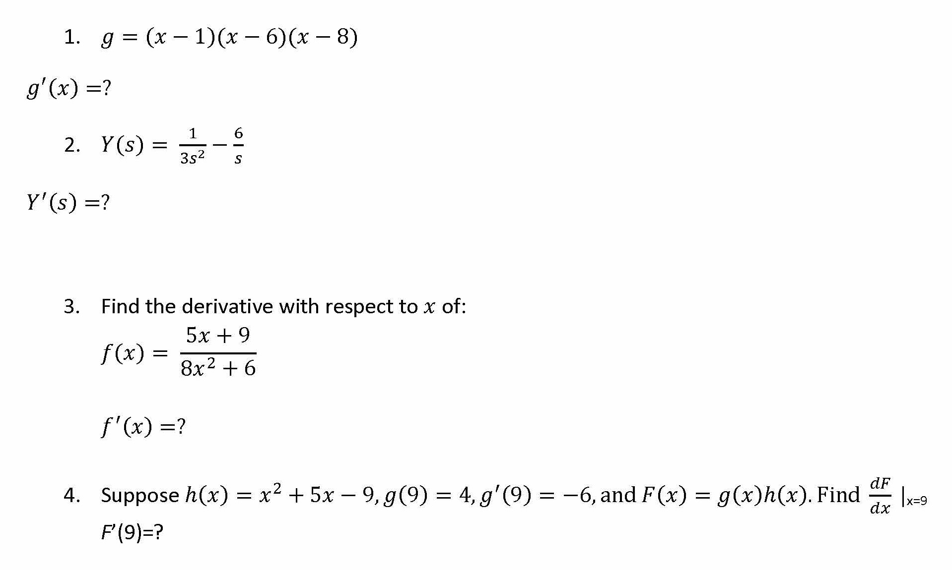 1. g-(x-1)(x-6)(x-8) - - - - g'(x) -7 2. Y(s) - s Y'(s) -? 3. ...