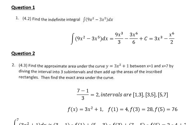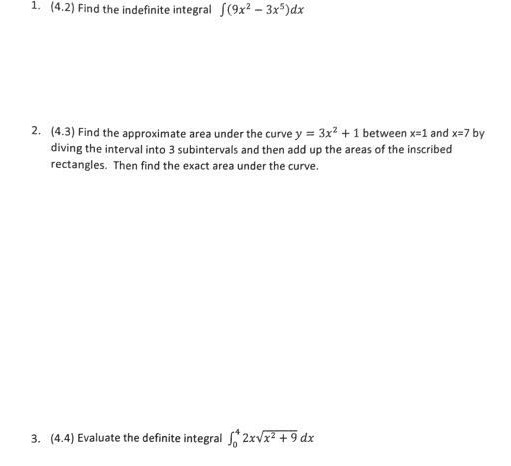 1. (4.2) Find the indefinite integral 1(9x2 -3x5)dx - 2. (4.3) Fin...