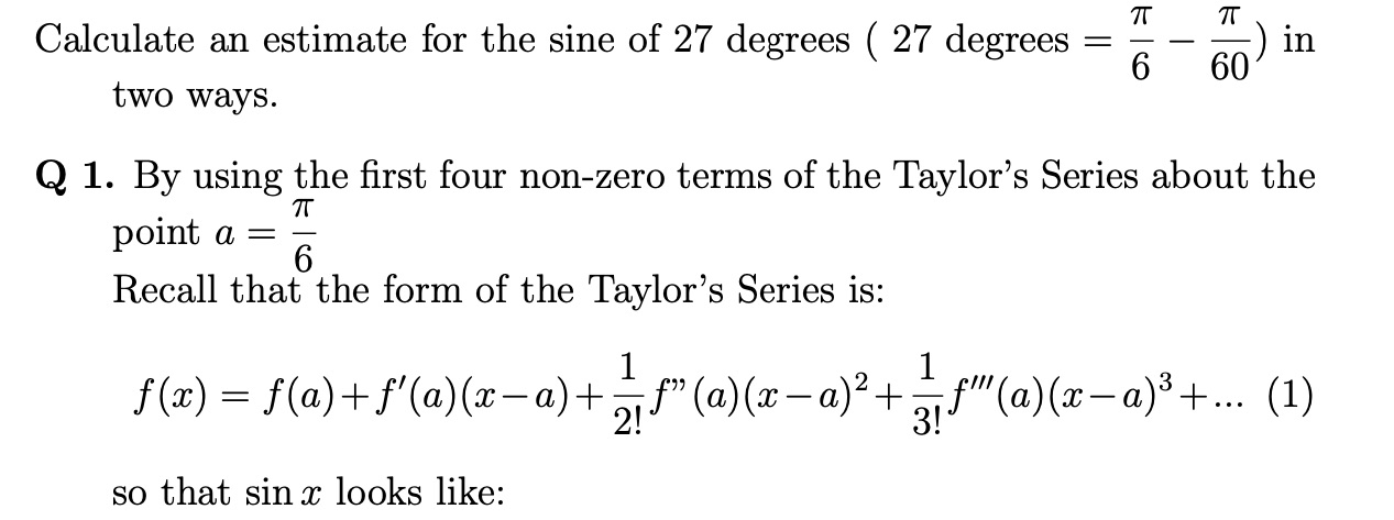 Calculate an estimate for the sine of 27 degrees (27 degrees = = = ...