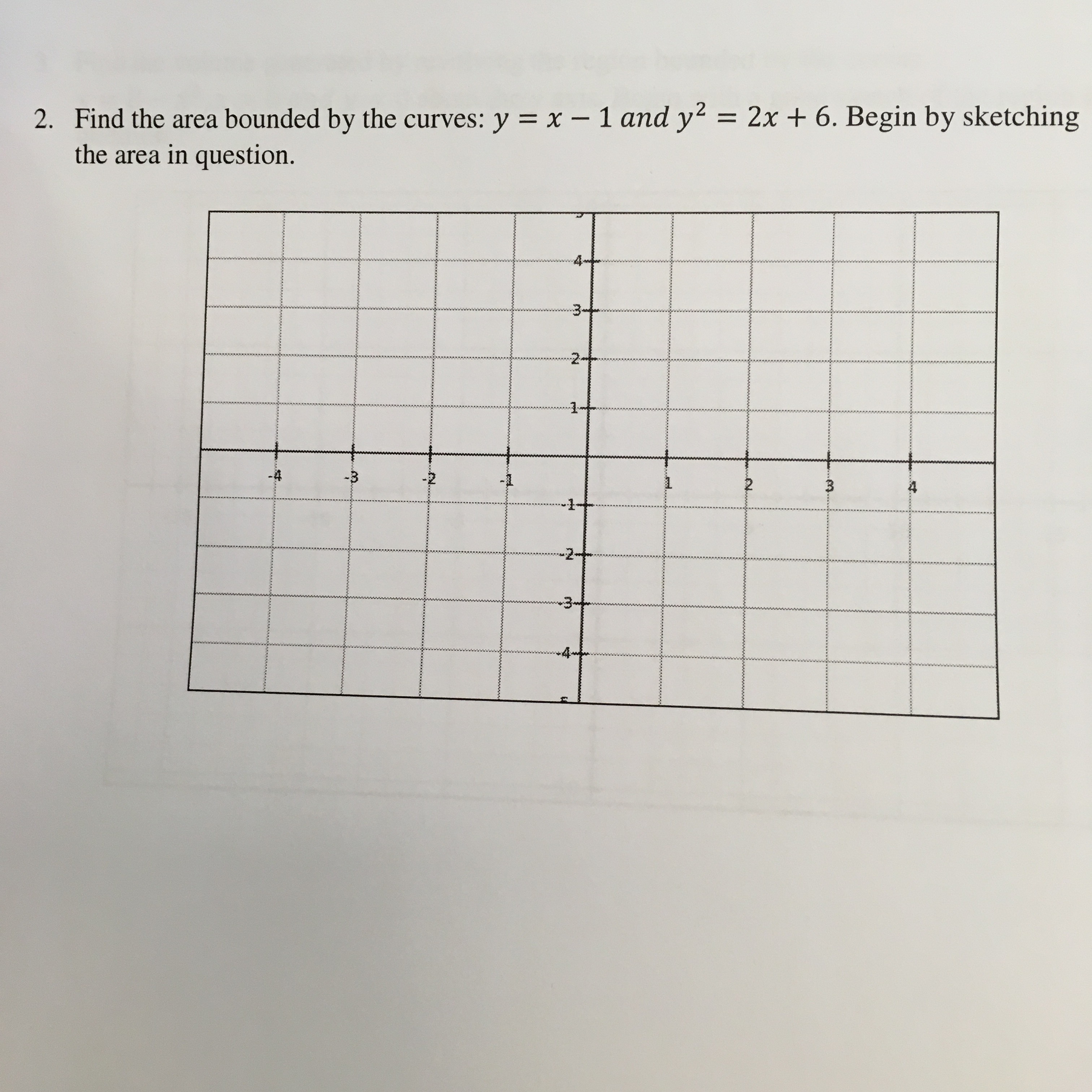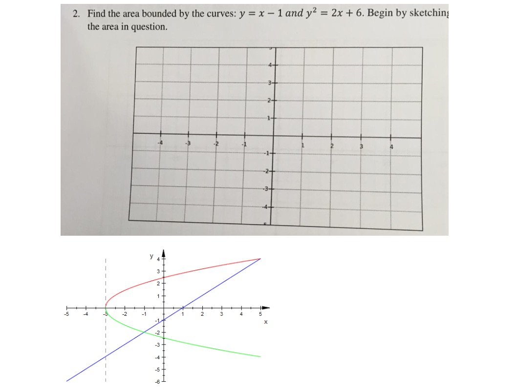 2. Find the area bounded by the curves: y = X - 1 and y2 = 2x + 6. ...
