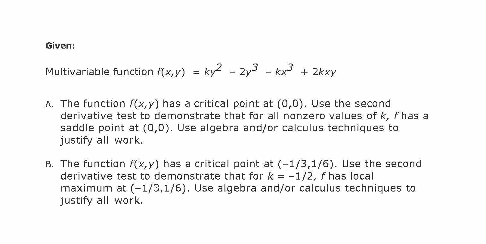 Given: Multivariable function f(x,y) = ky2 - 2y3 - kx3 + 2kxy A....