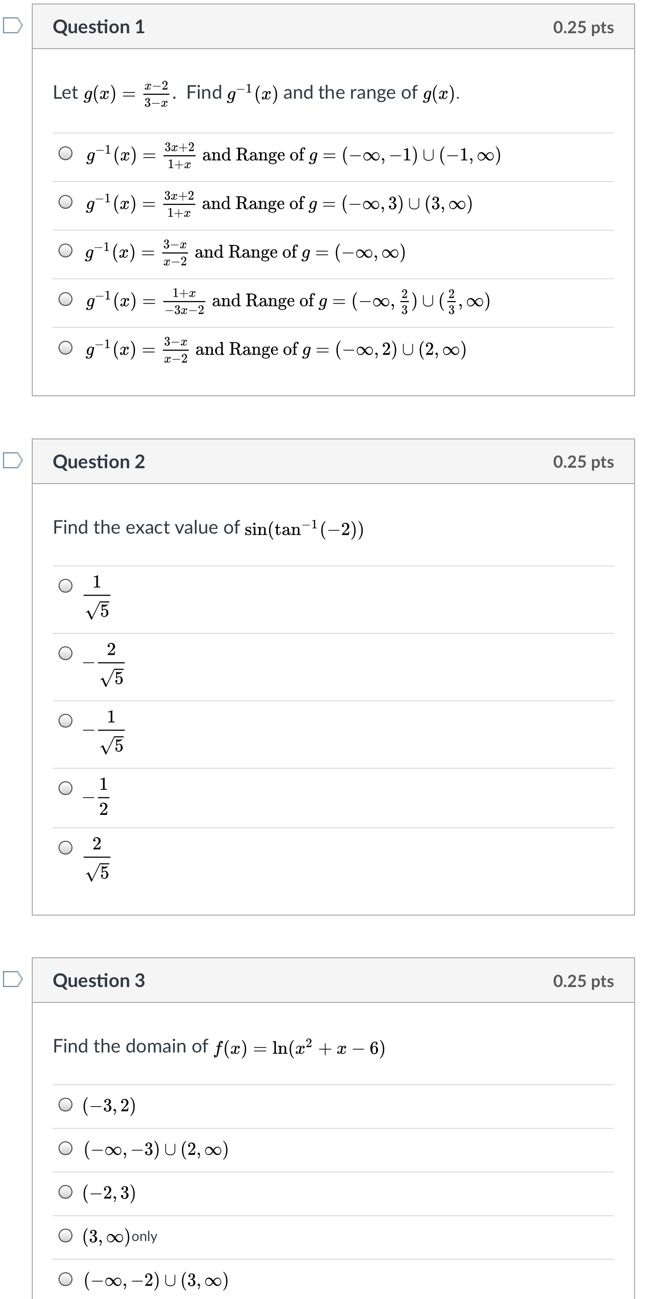 Question 1 0.25 pts Let g(x) = 3-x Find g-1(x) and the range of ...