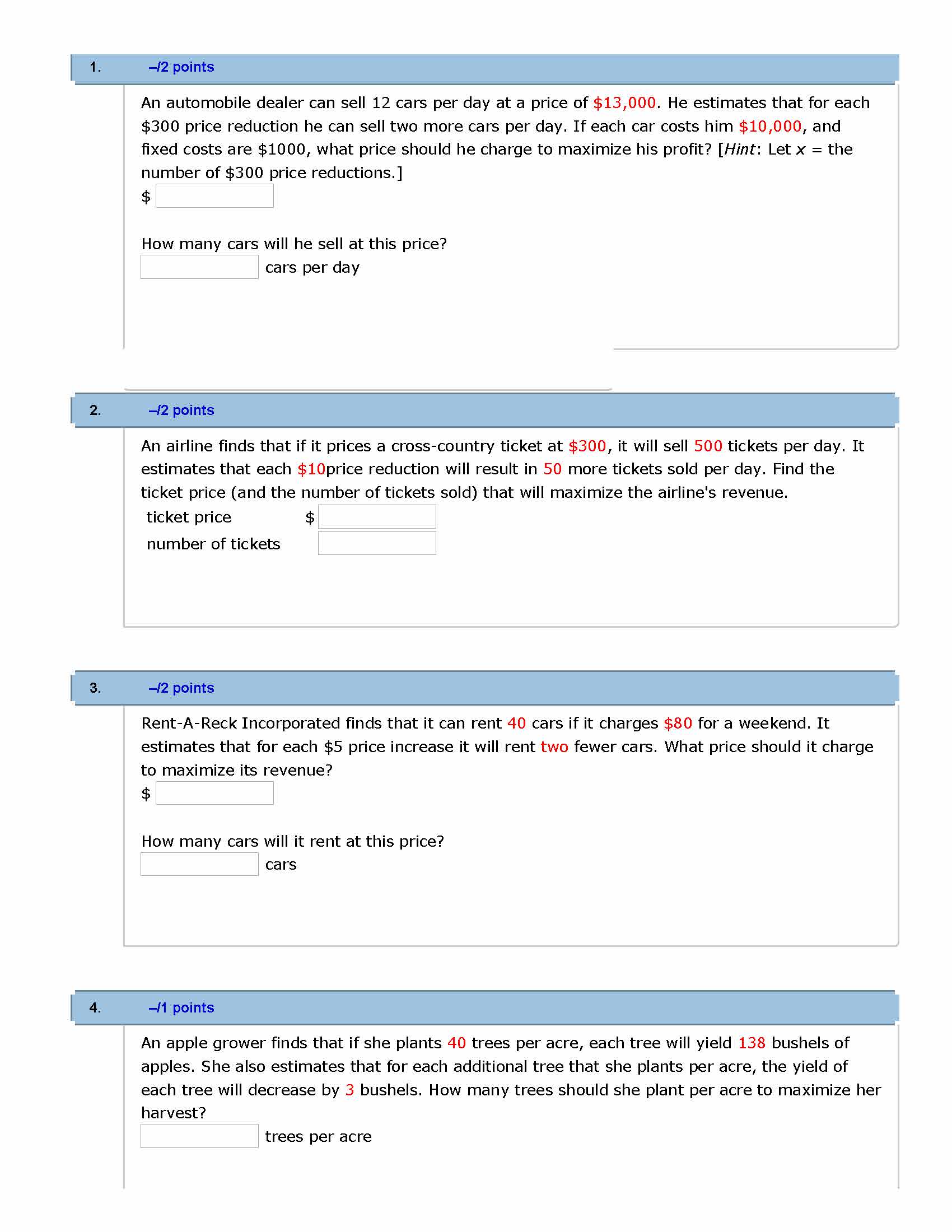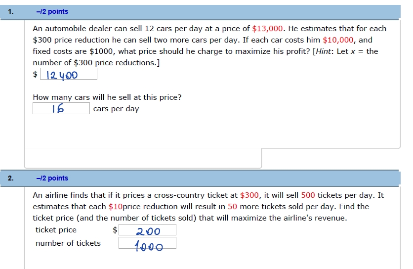 1. –/2 points An automobile dealer can sell 12 cars pe...