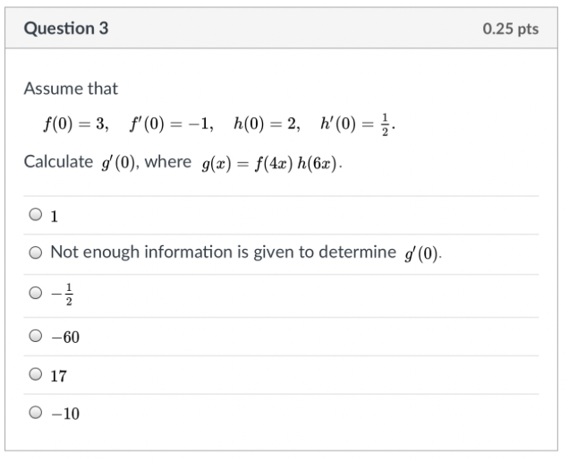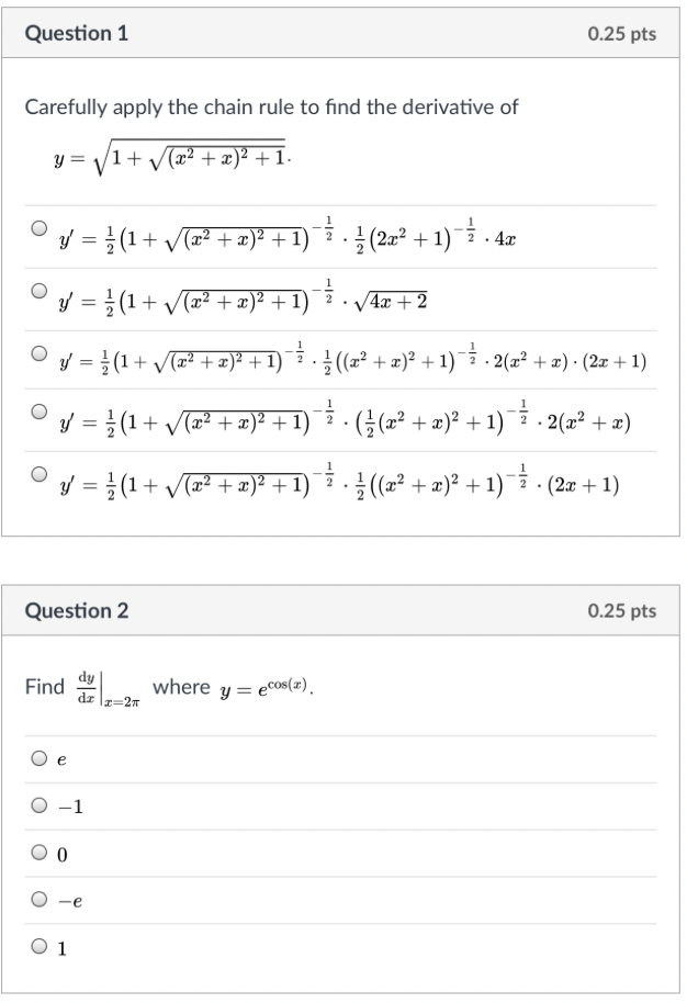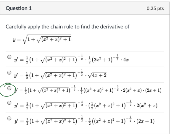 Question 1 0.25 pts Carefully apply the chain rule to find the de...