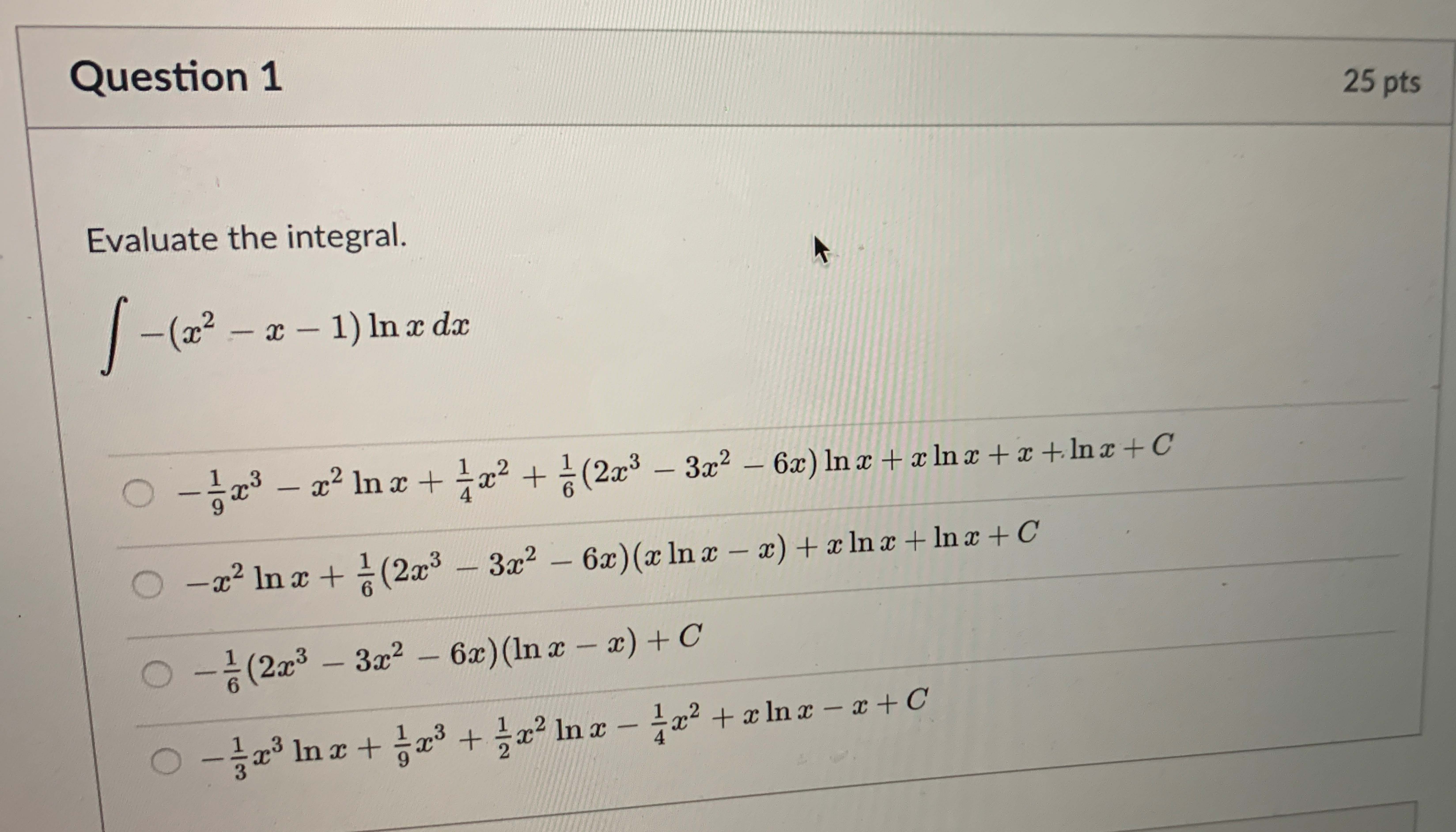 Question 1 25 pts Evaluate the integral. - -x - 1) In x dx - 9 ...