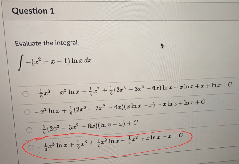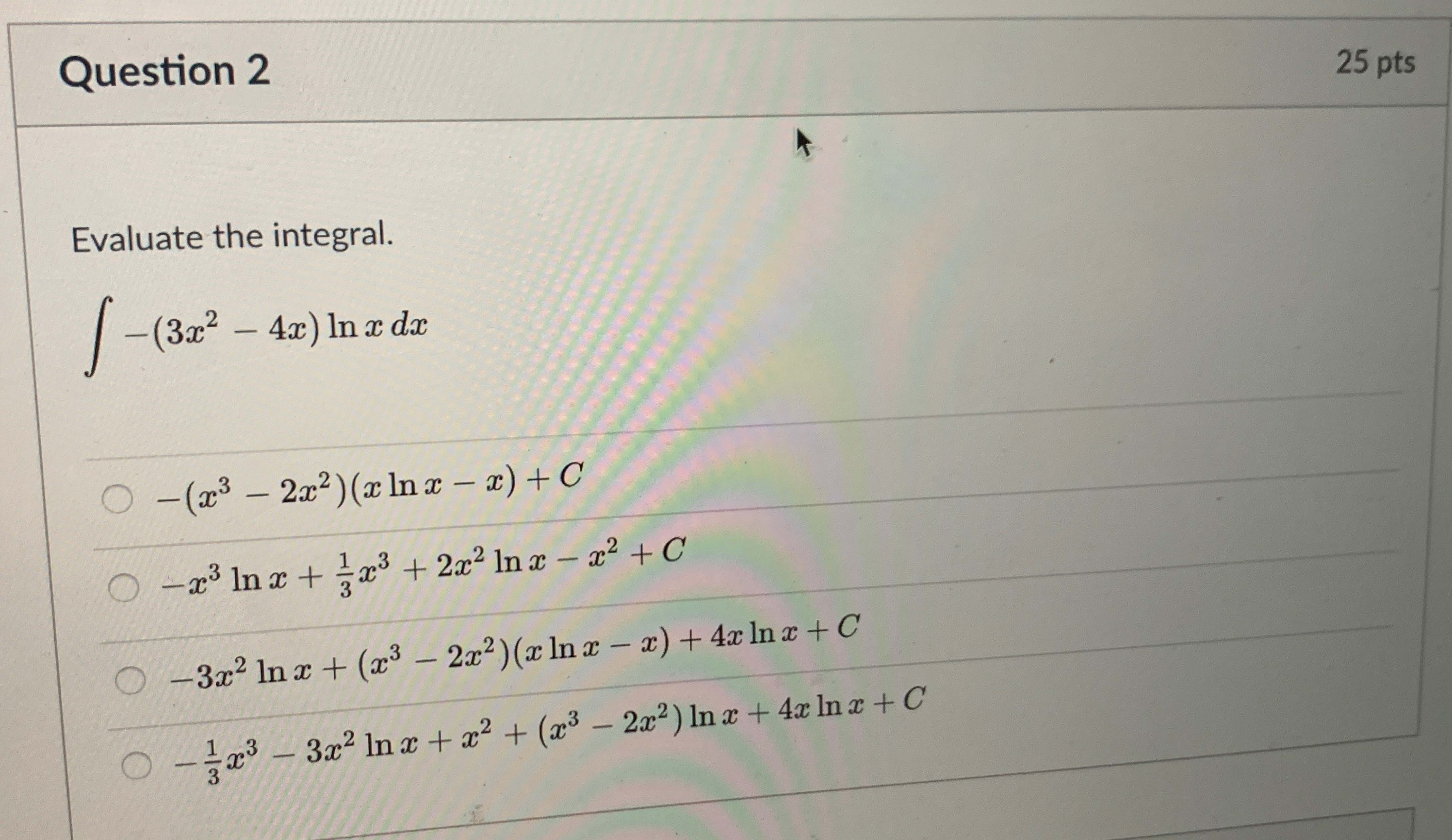 Question 1 25 pts Evaluate the integral. - -x - 1) In x dx - 9...