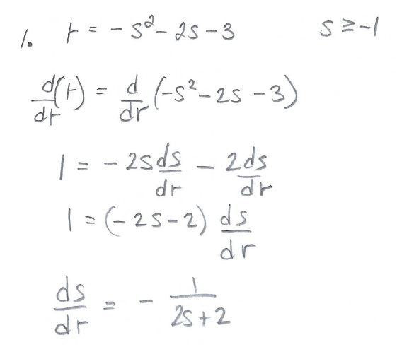 1) Suppose r = -32 - 2s 3 with 8 -1. Find ds/dr when 8 = 0 in two w...