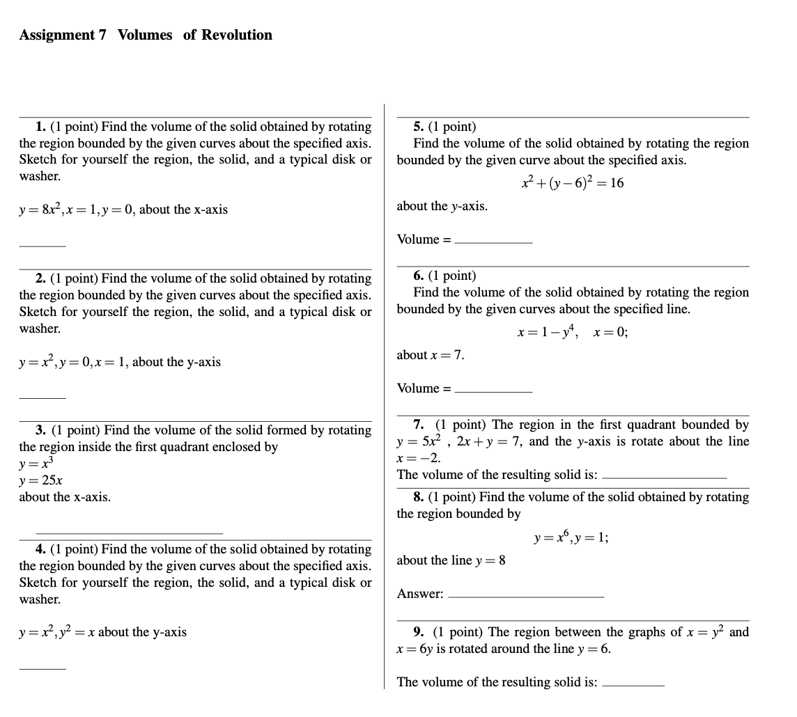 Assignment 7 Volumes of Revolution 1. (1 point) Find the volume of...