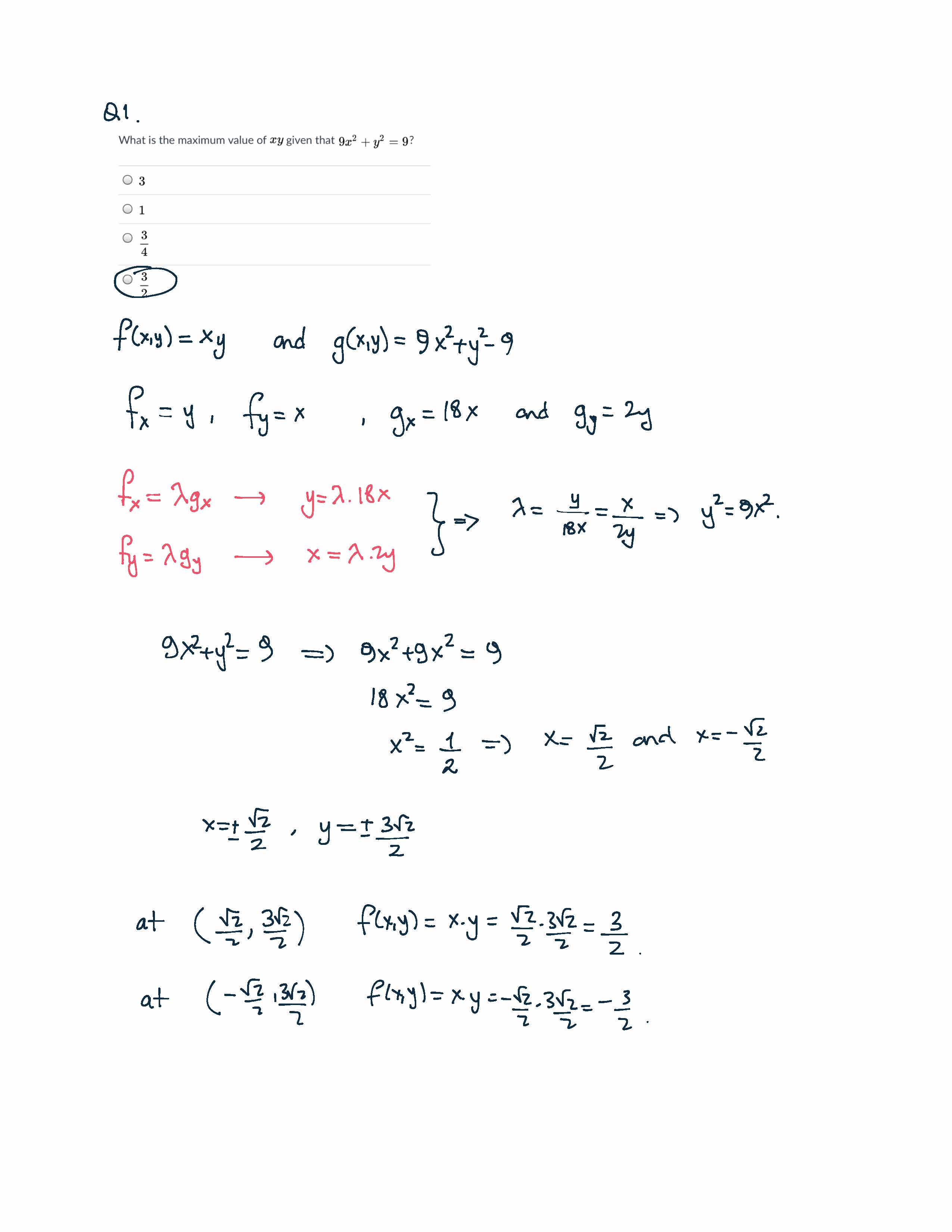 What is the maximum value of xy given that 9x2 + y2 = 9? = 3 1 3...