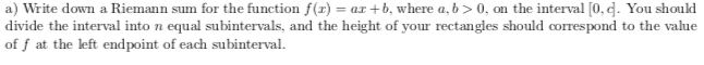 a) Write down a Riemann sum for the function f(x) = ar +b. where a...