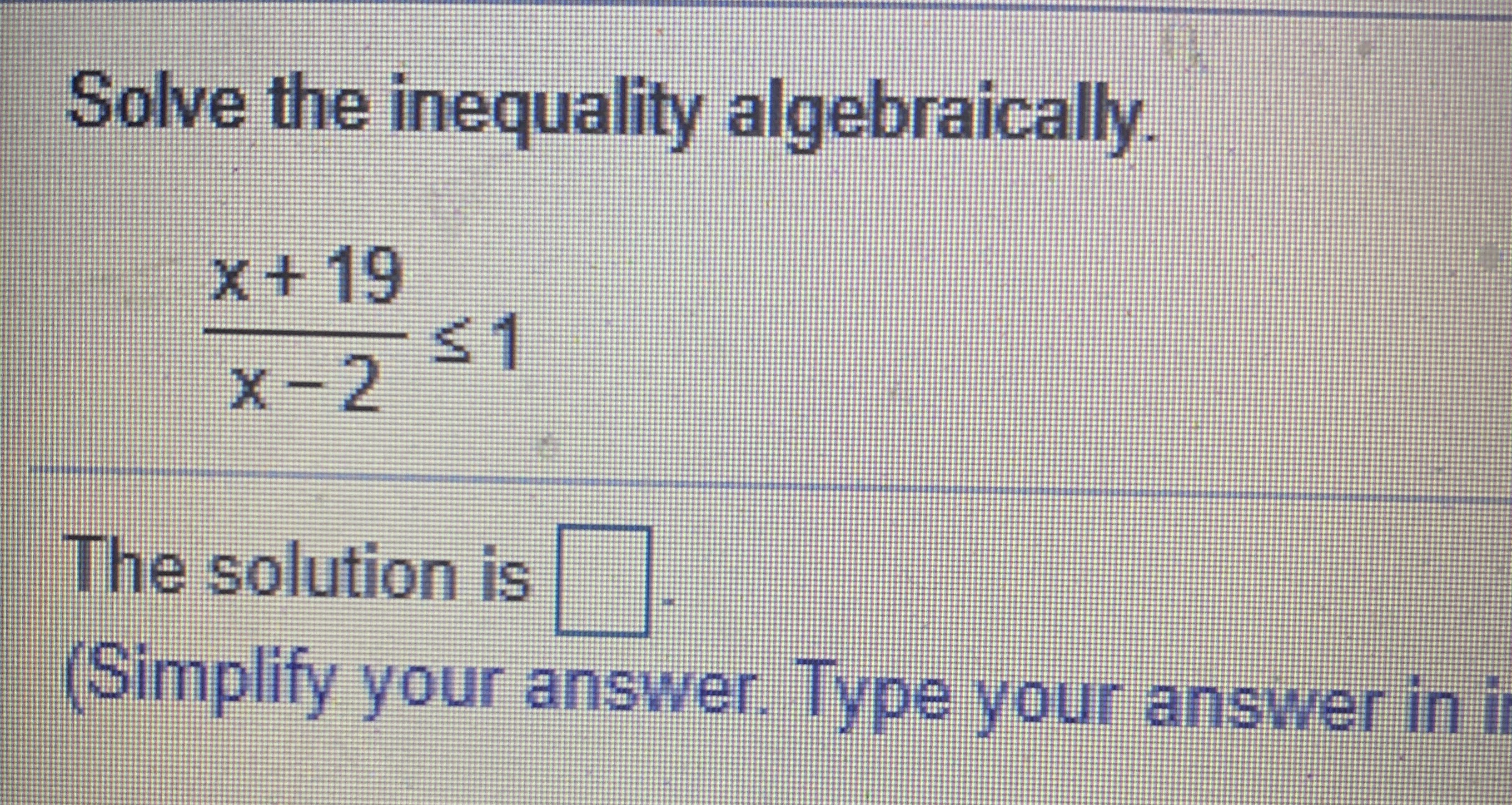 Solve the inequality algebraically. X+ 19 <1 x-2 - The solu...