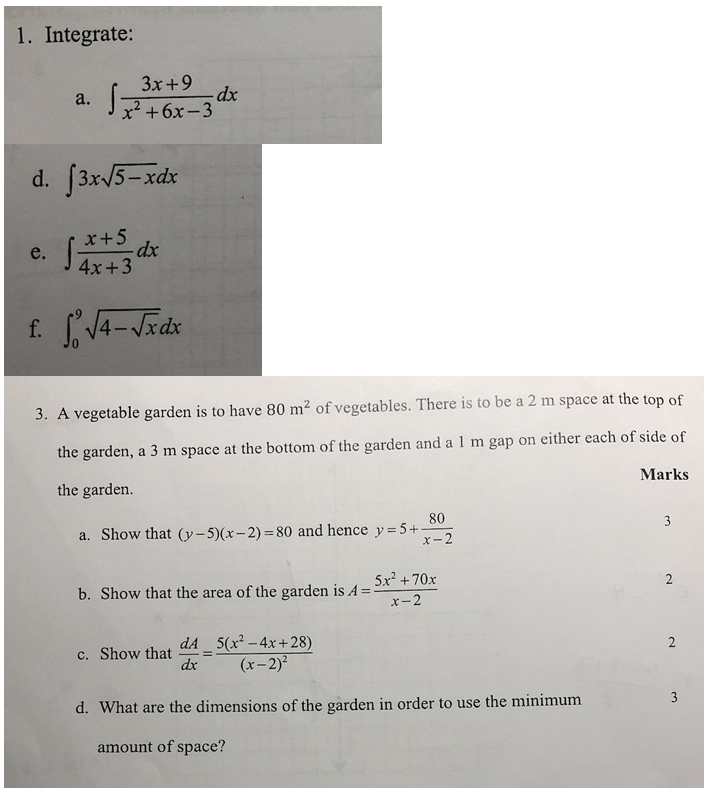 1. Integrate: 3x+9 a. dx x² +6x- 3 d. [3xV5-xdx e. S x+5 dx...