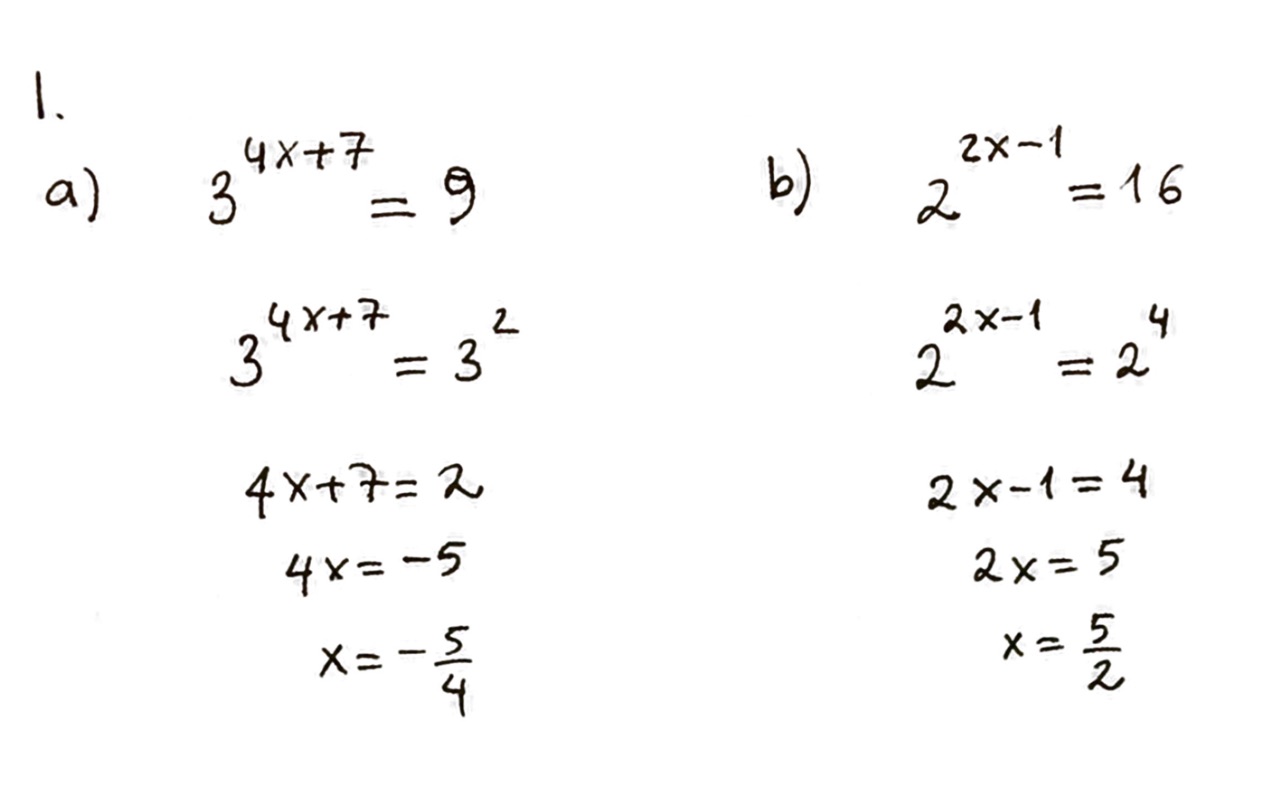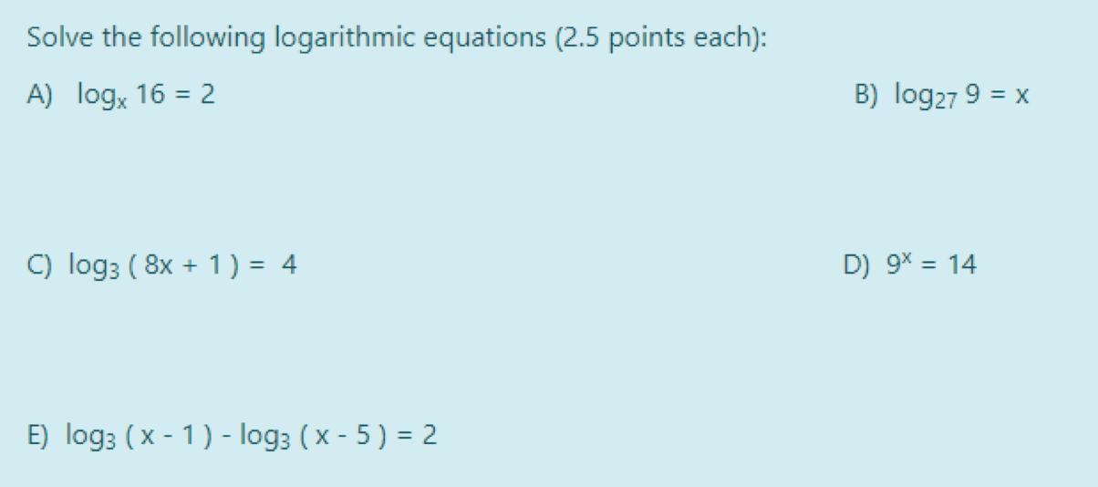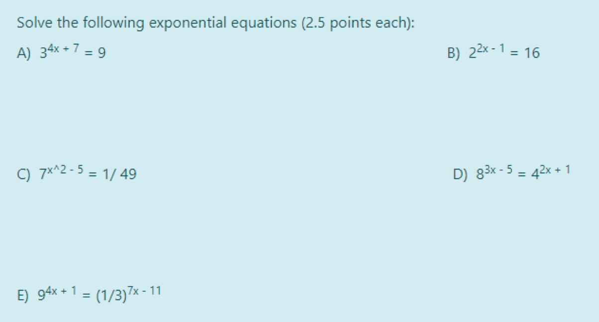 Solve the following exponential equations (2.5 points each): A) 34...