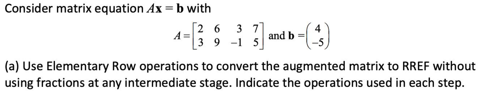 Consider matrix equation Ax = b with 2 6 3 7 A = 9 -1 5 3 and b...