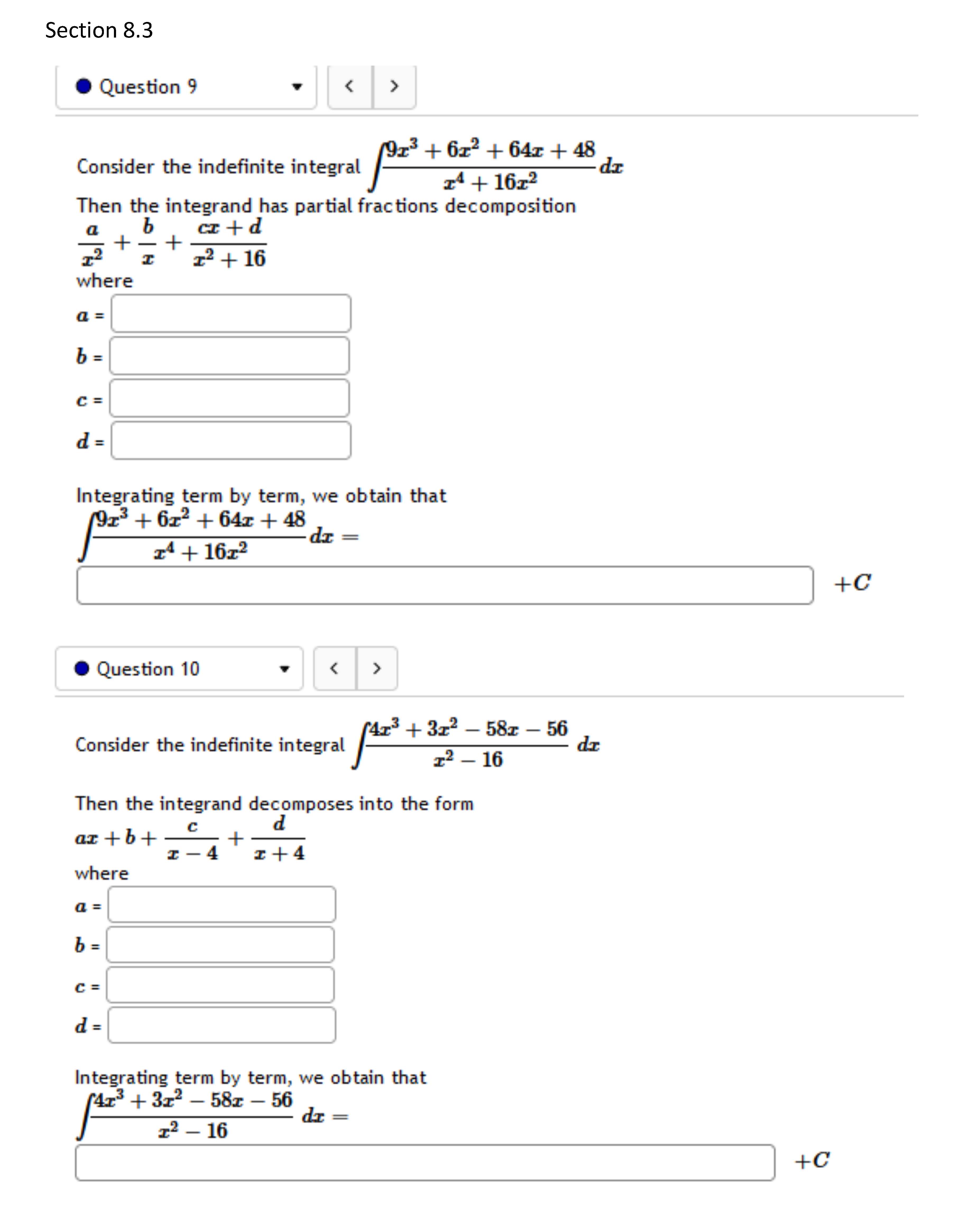 Section 8.3 Question 9 < > pass 9.³ dx + 6x² + 64x + 48...
