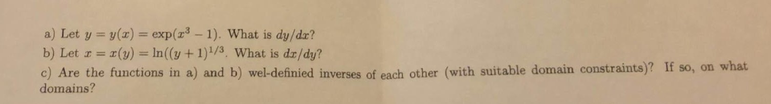 a) Lety=y(x)exp(3-1) What is dy/dx? b) Letrx(y)=In((y+1)1/3 What i...