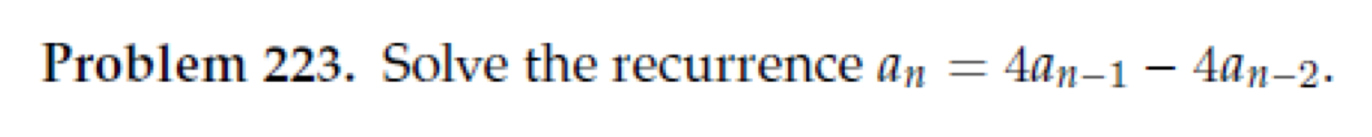Problem 223. Solve the recurrence an = 4an-1 - 4an-2.