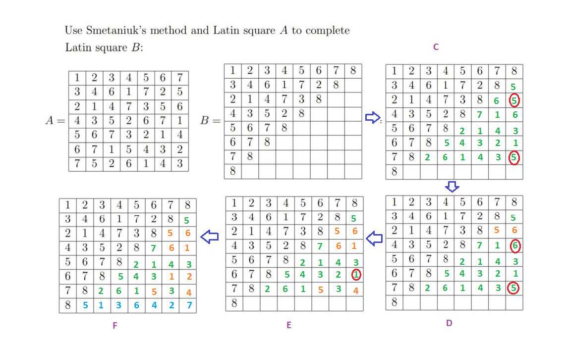 Use Smetaniuk's method and Latin square A to complete Latin square...