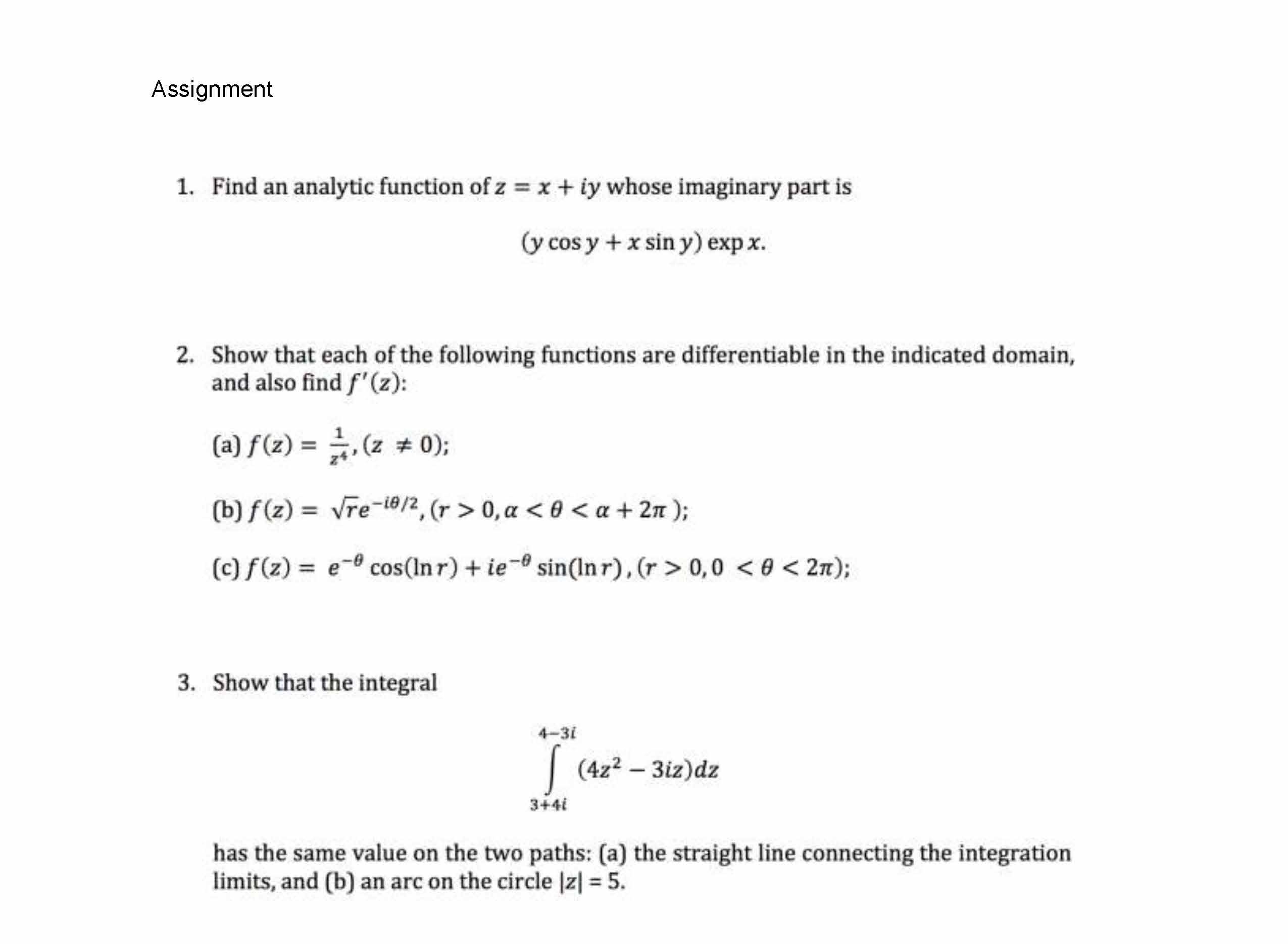 Assignment 1. Find an analytic function of Z = x + iy whose imagin...