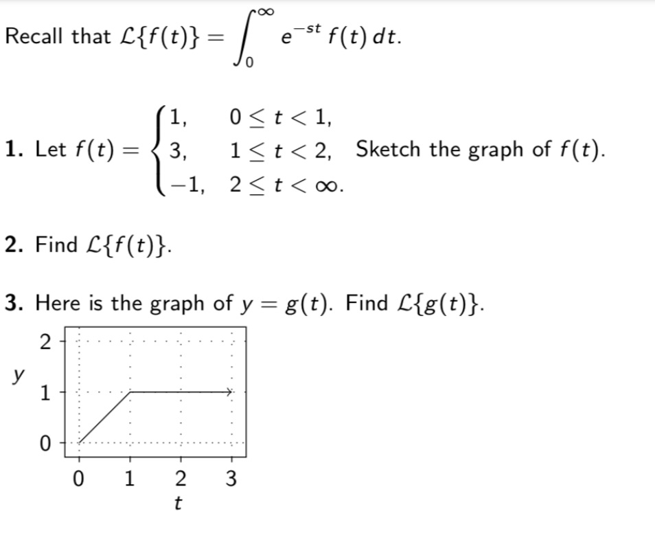 Recall that L{f(t)} = /e-st f(t)dt. 1, 01. Let f(t) = 3, 1-1, ...