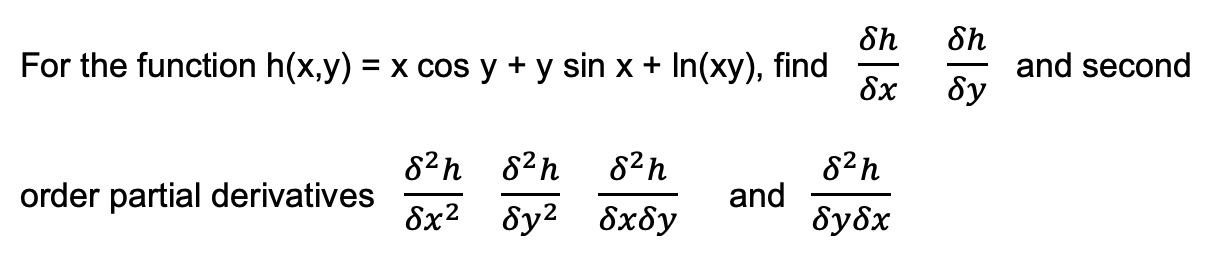 For the function h(x,y) = x cos y + y sin x + ln(xy), find δh/δ...