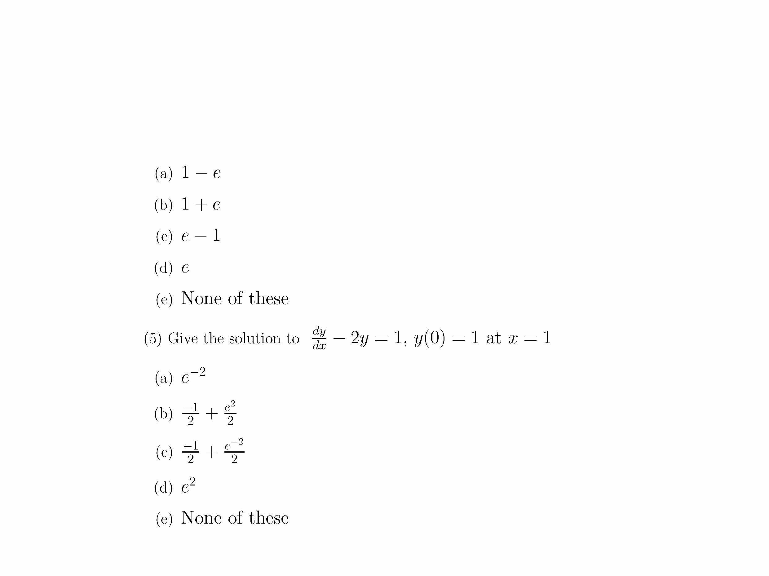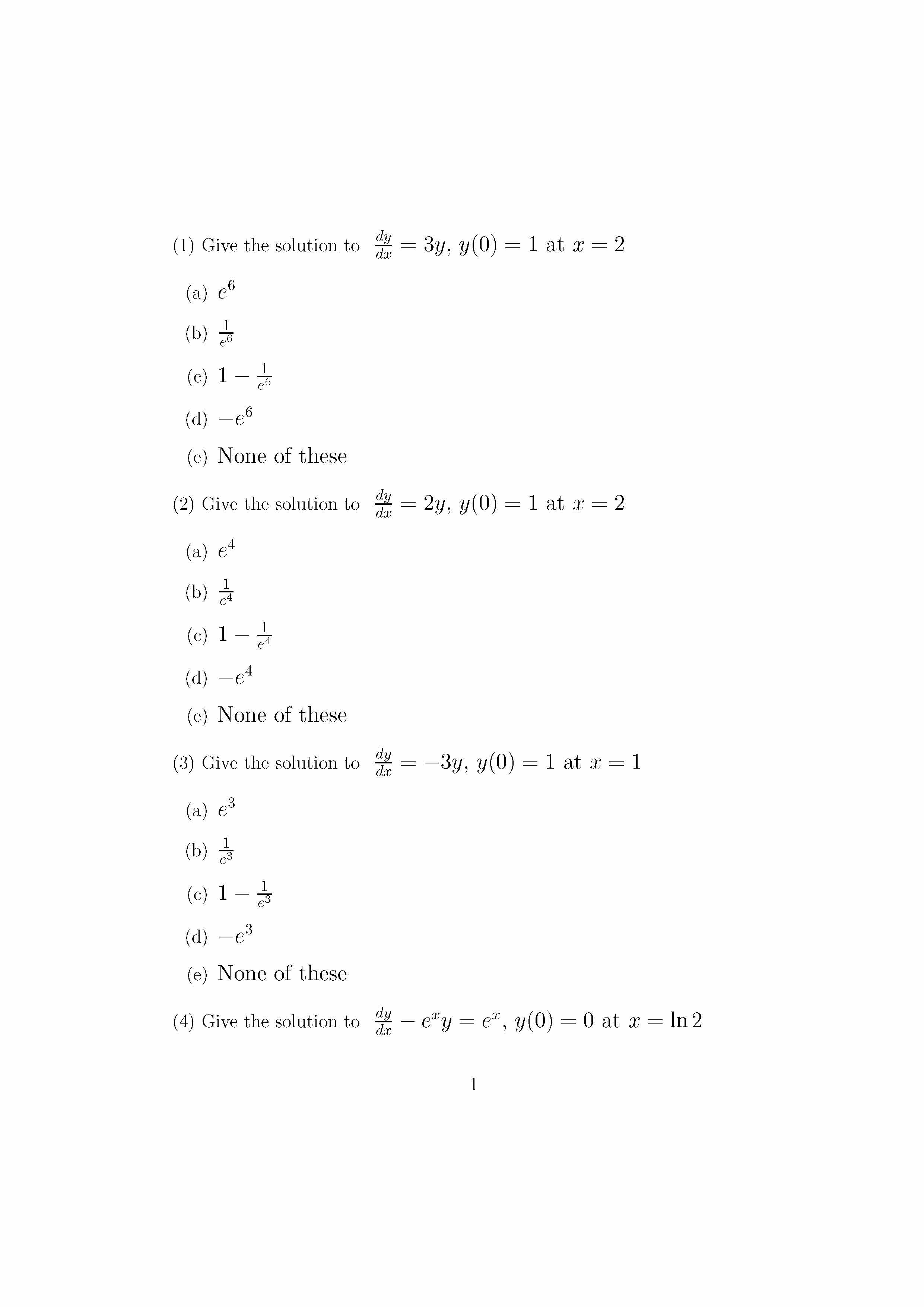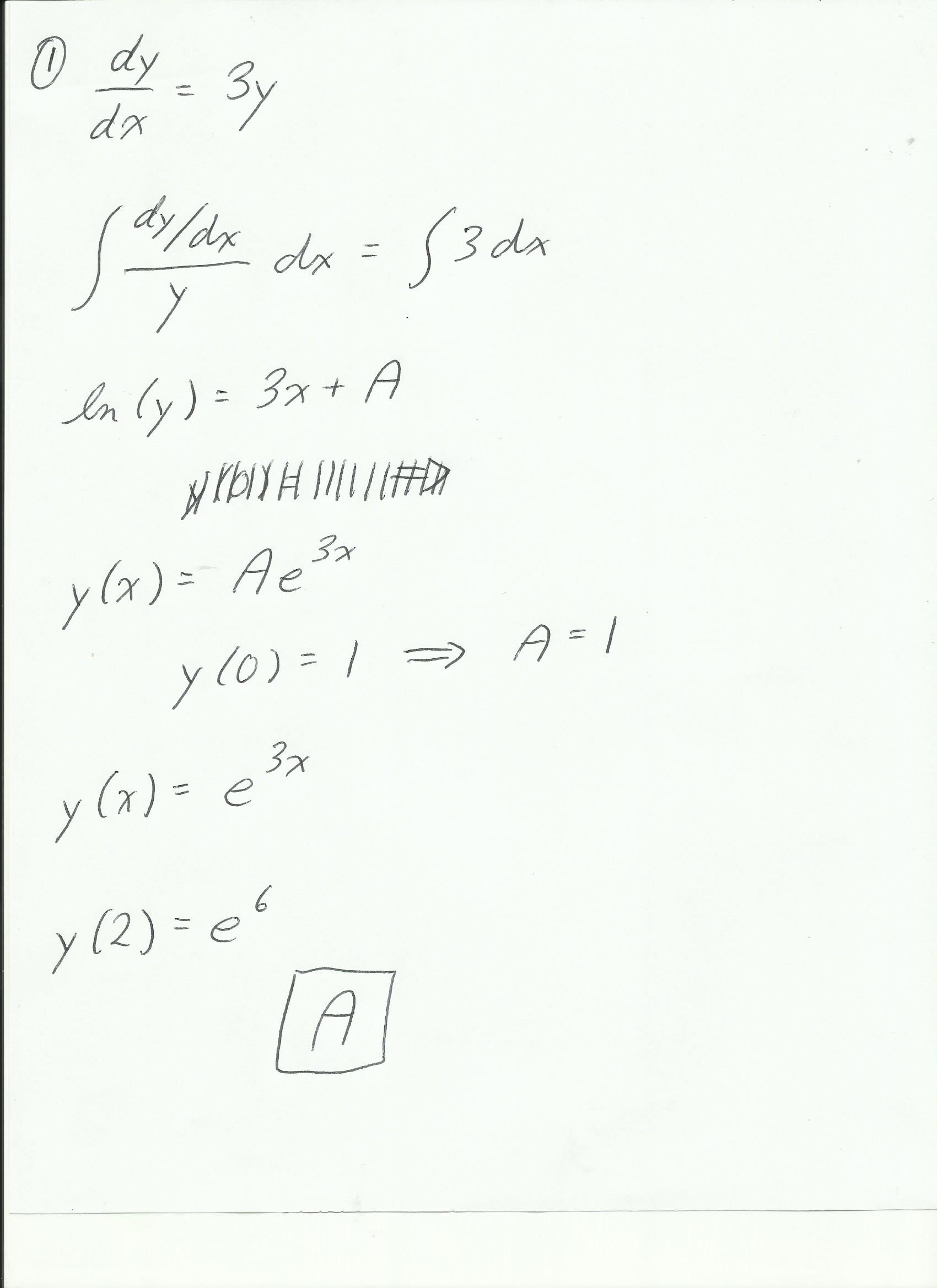 (1) Give the solution to dy da = =3y,3(0) = 1 at x = 2 (a) e (b)...