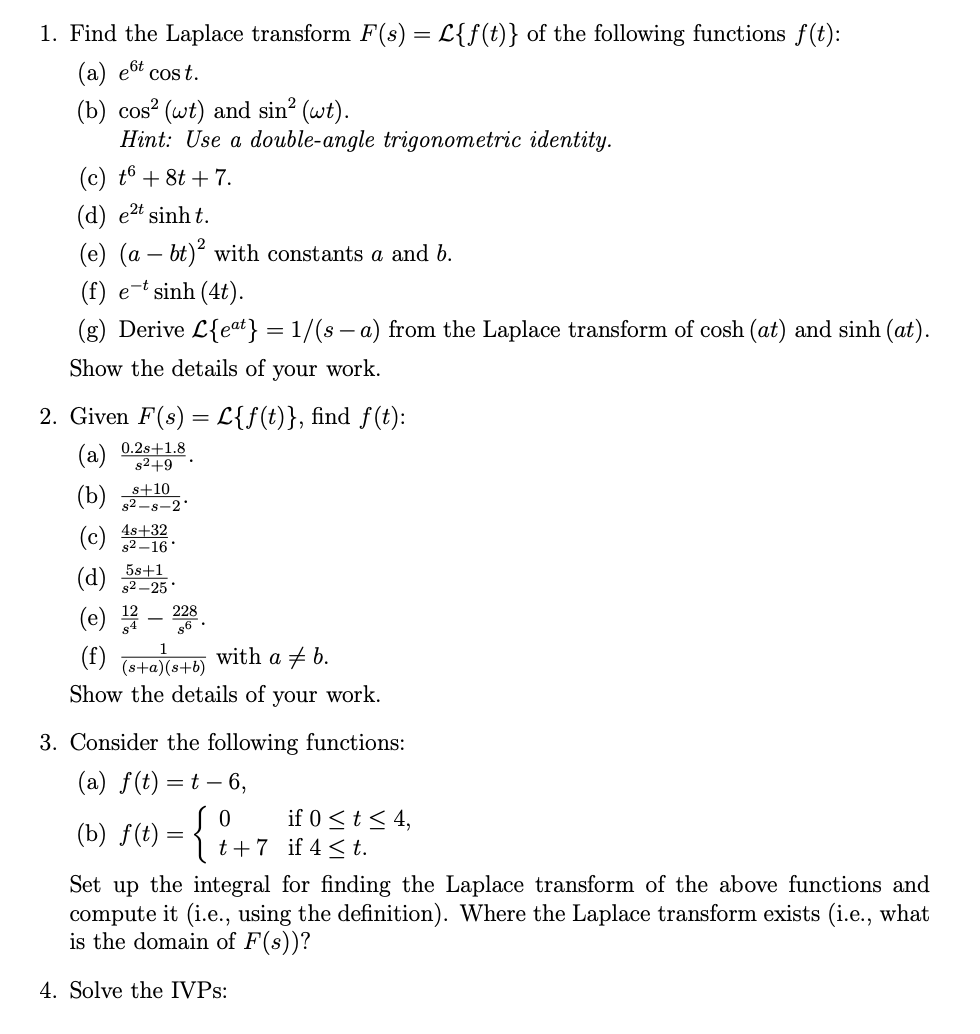 1. Find the Laplace transform F(s) = { {{{f(t)} = of the following ...