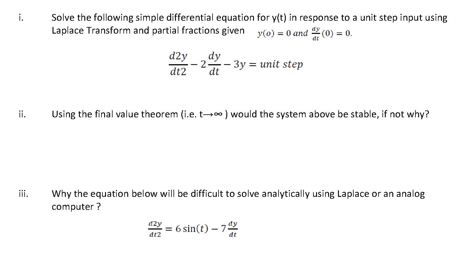 i. Solve the following simple differential equation for y(t) in re...