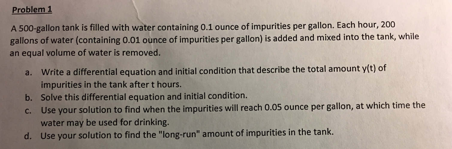 Problem 1 A 500-gallon tank is filled with water containing 0.1 o...