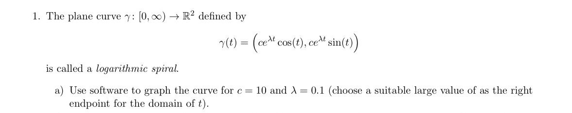 1. The plane curve Y: [0, 00) R2 defined by y(t) = = (ce**cos(t),e...