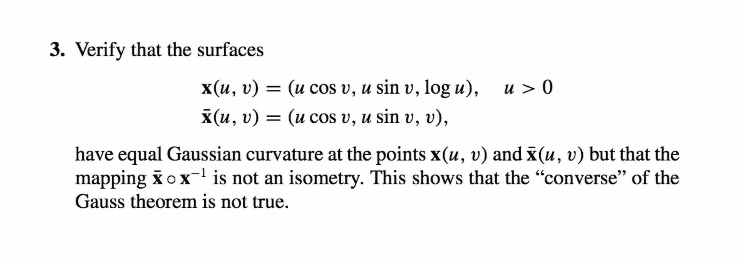 3. Verify that the surfaces x(u, v) = (u cos v, sin v, log u), u&g...