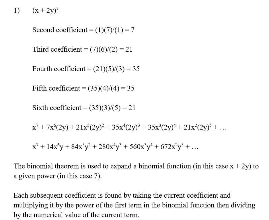 1. Use the Binomial Theorem to find the 5th term in (x + 2y)â· ...