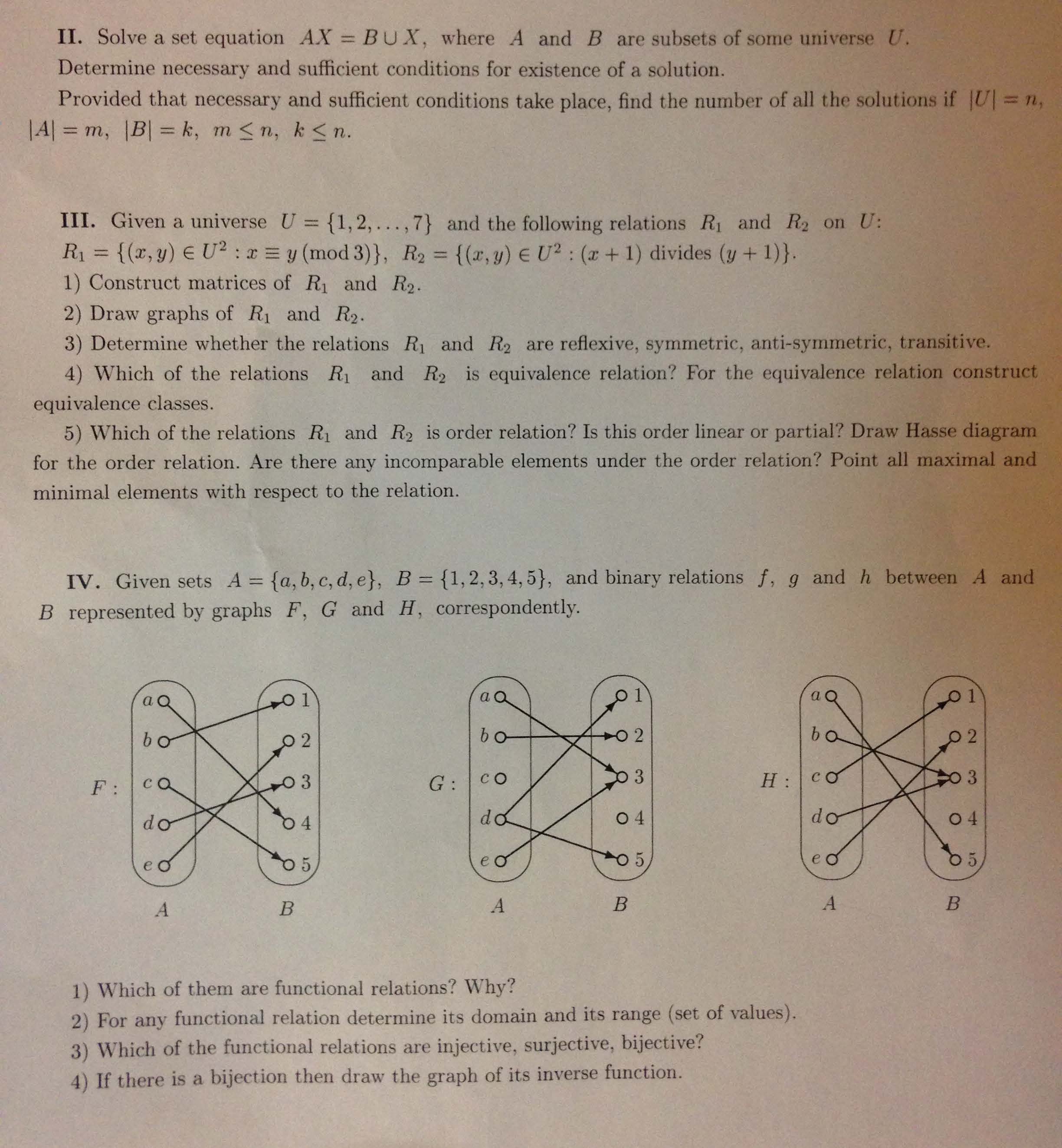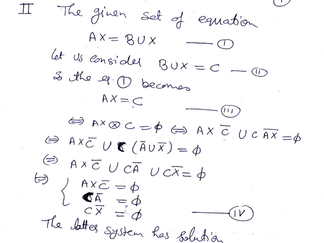 II. Solve a set equation AX = BUX, where A and B are subsets of som...