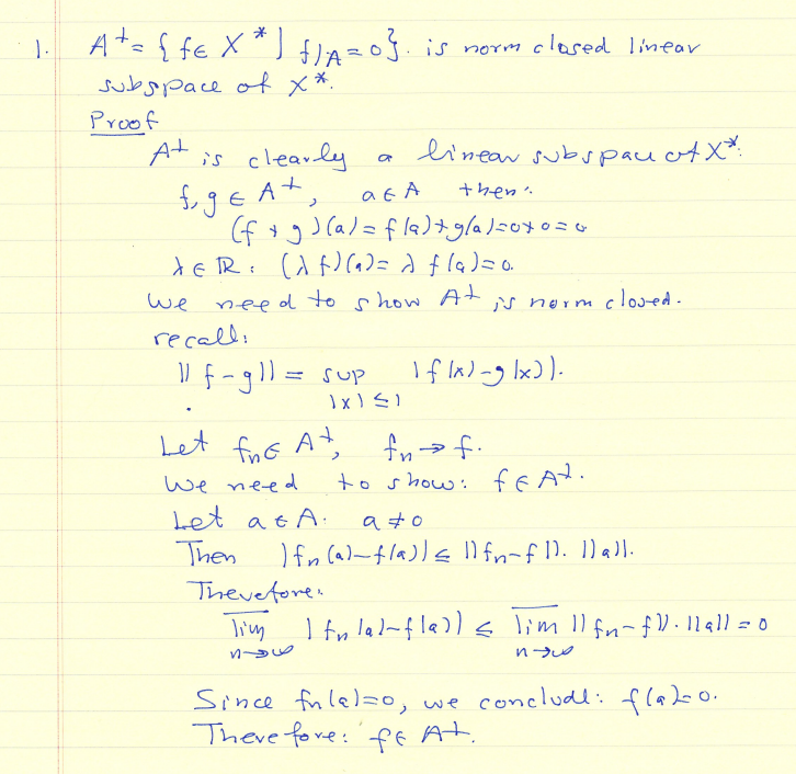 1. Let X be a norm space and A be a subset of X. Let A⊥ = {f ∈...