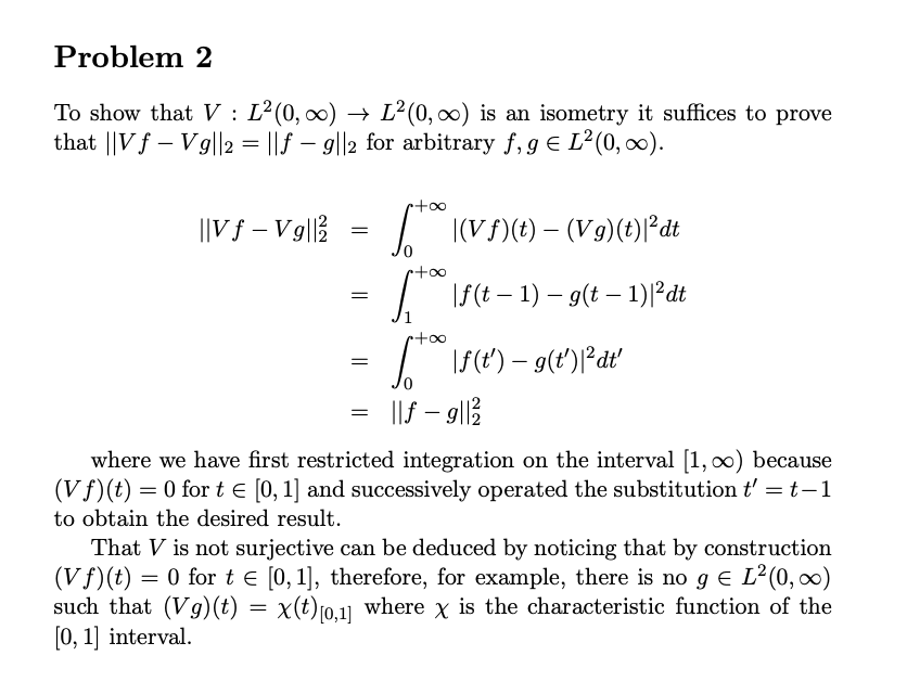 2. Define V: L2(0,00)+L-(2,00) by (Vf)(t)=f(t-1) if 1>1 and (Vf)...