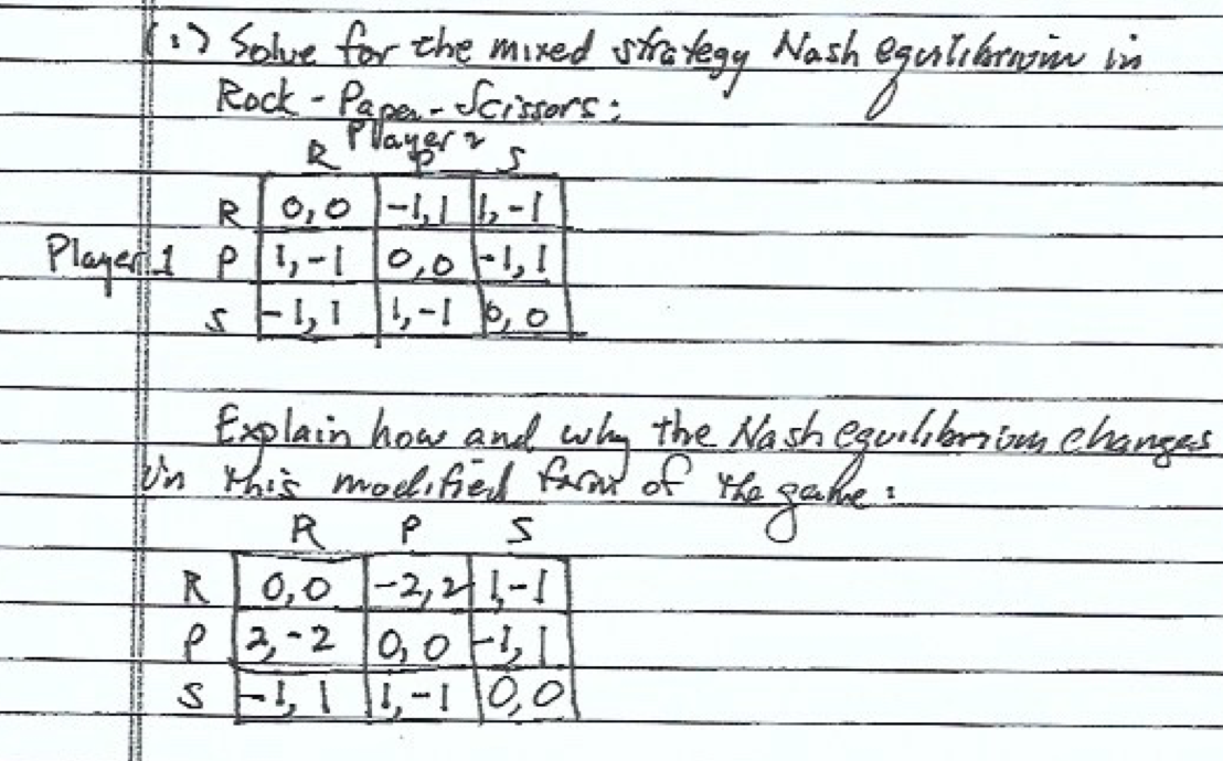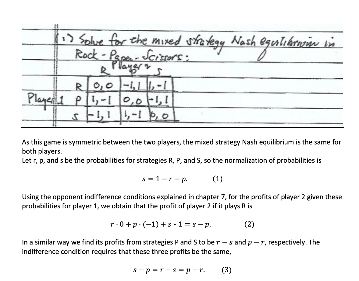1) Solve for the mixed strategy Nash in Rock - Paper - Scissors:...