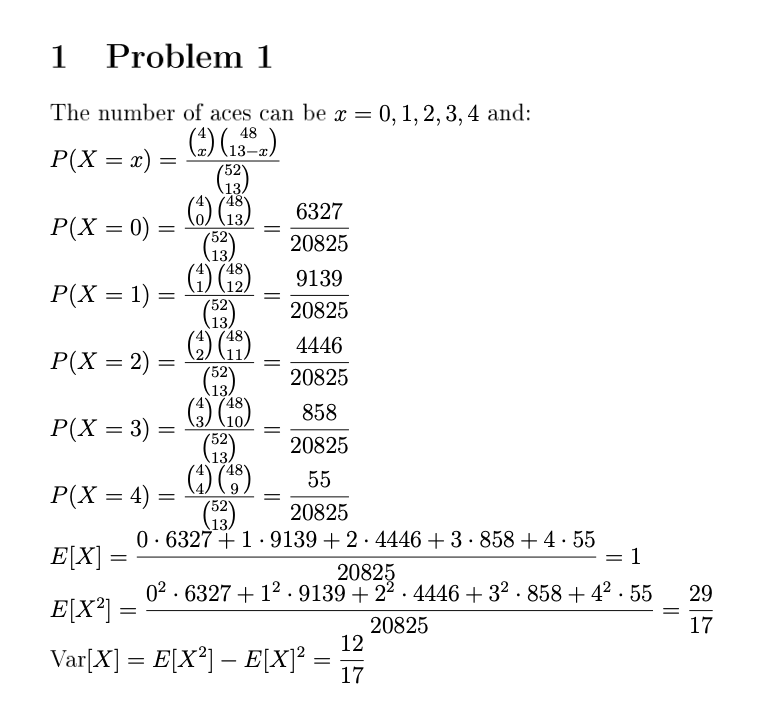Problem 1 In a bridge hand (13 cards) let X denote the number of ac...