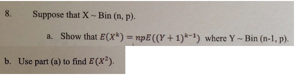 8. Suppose that X - Bin (n, p). a. Show that E(X*) = npE((Y + 1)*...