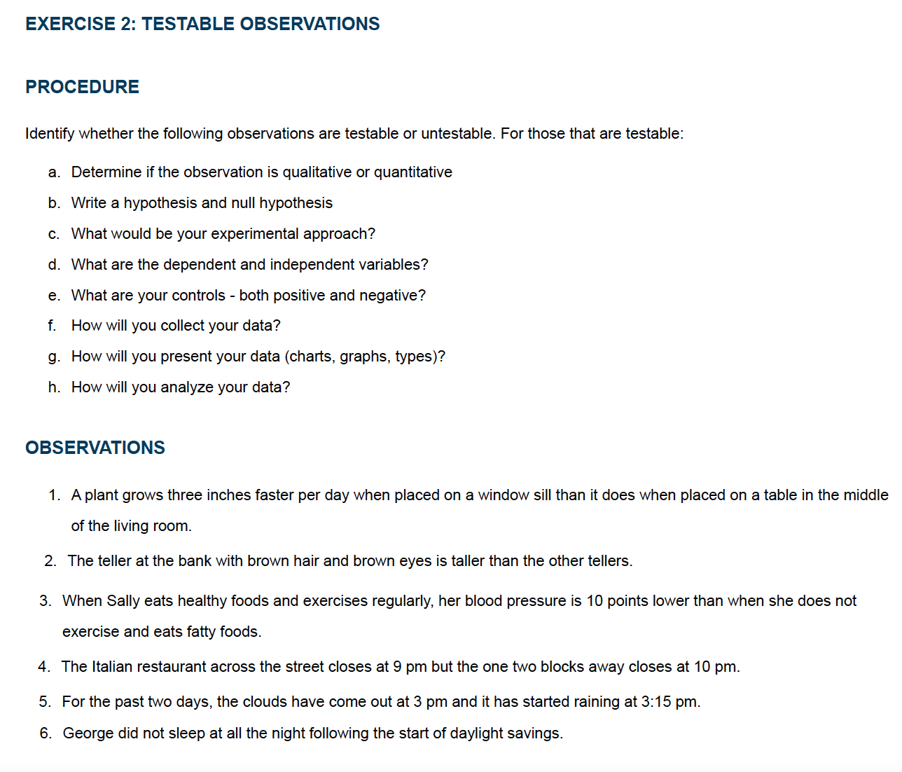 EXERCISE 2: TESTABLE OBSERVATIONS PROCEDURE Identify whether the ...