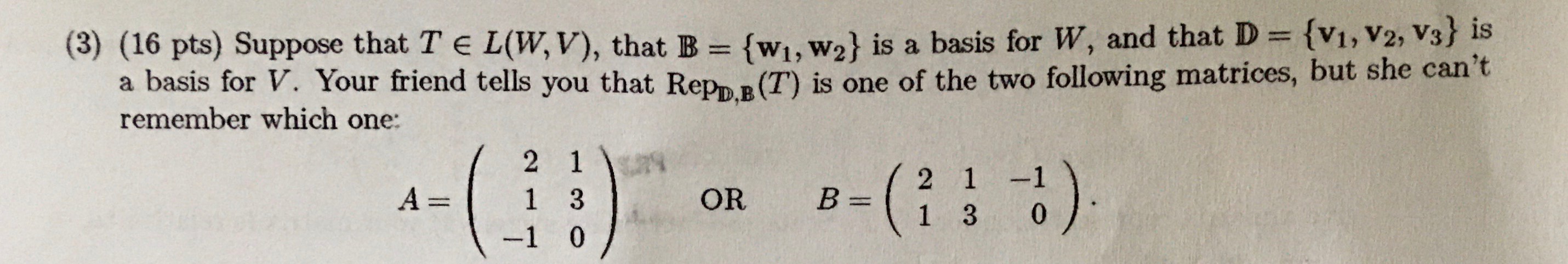 (3) (16 pts) Suppose that TeL(W,V), that B = {W1, W2} is a basis fo...