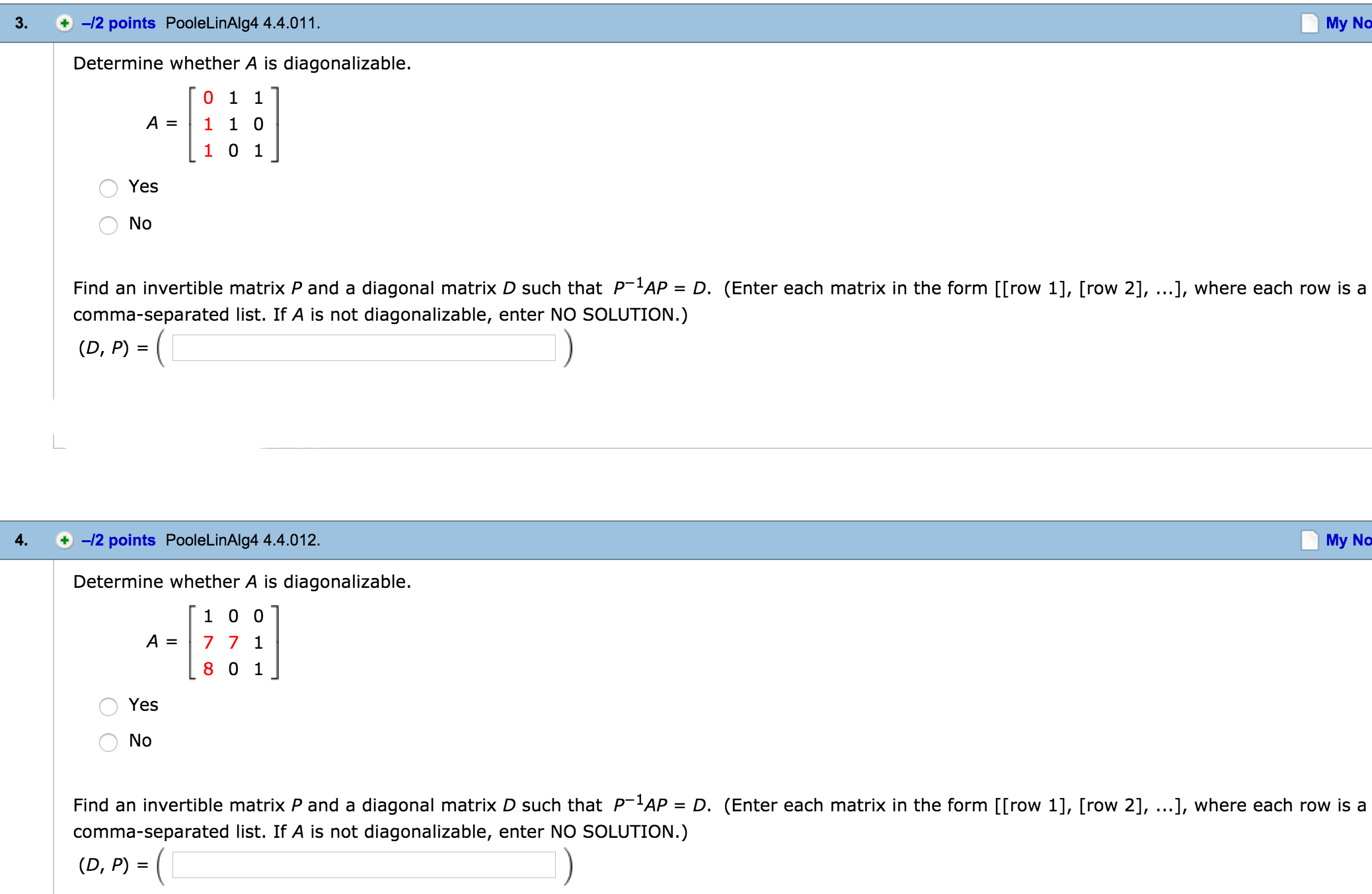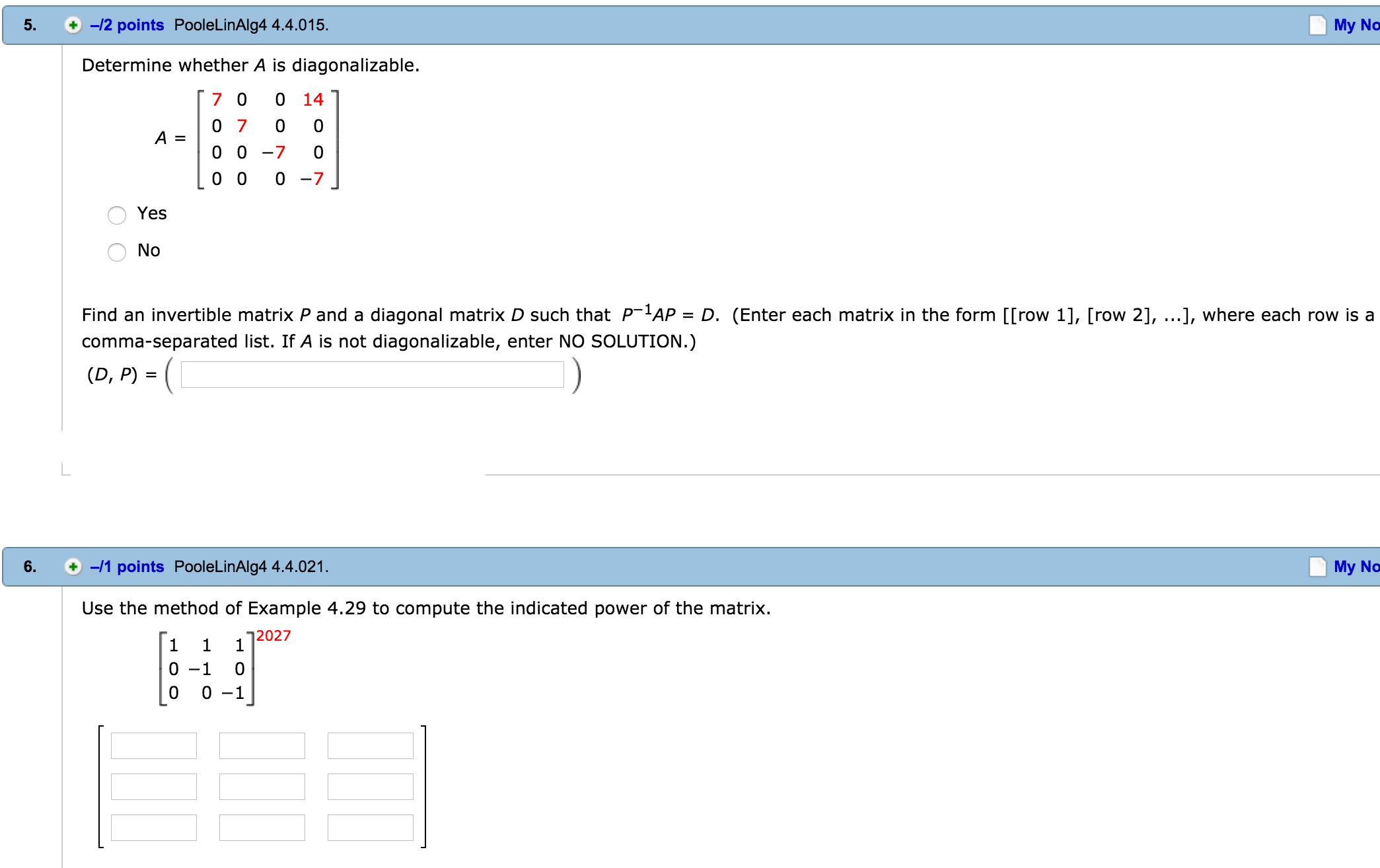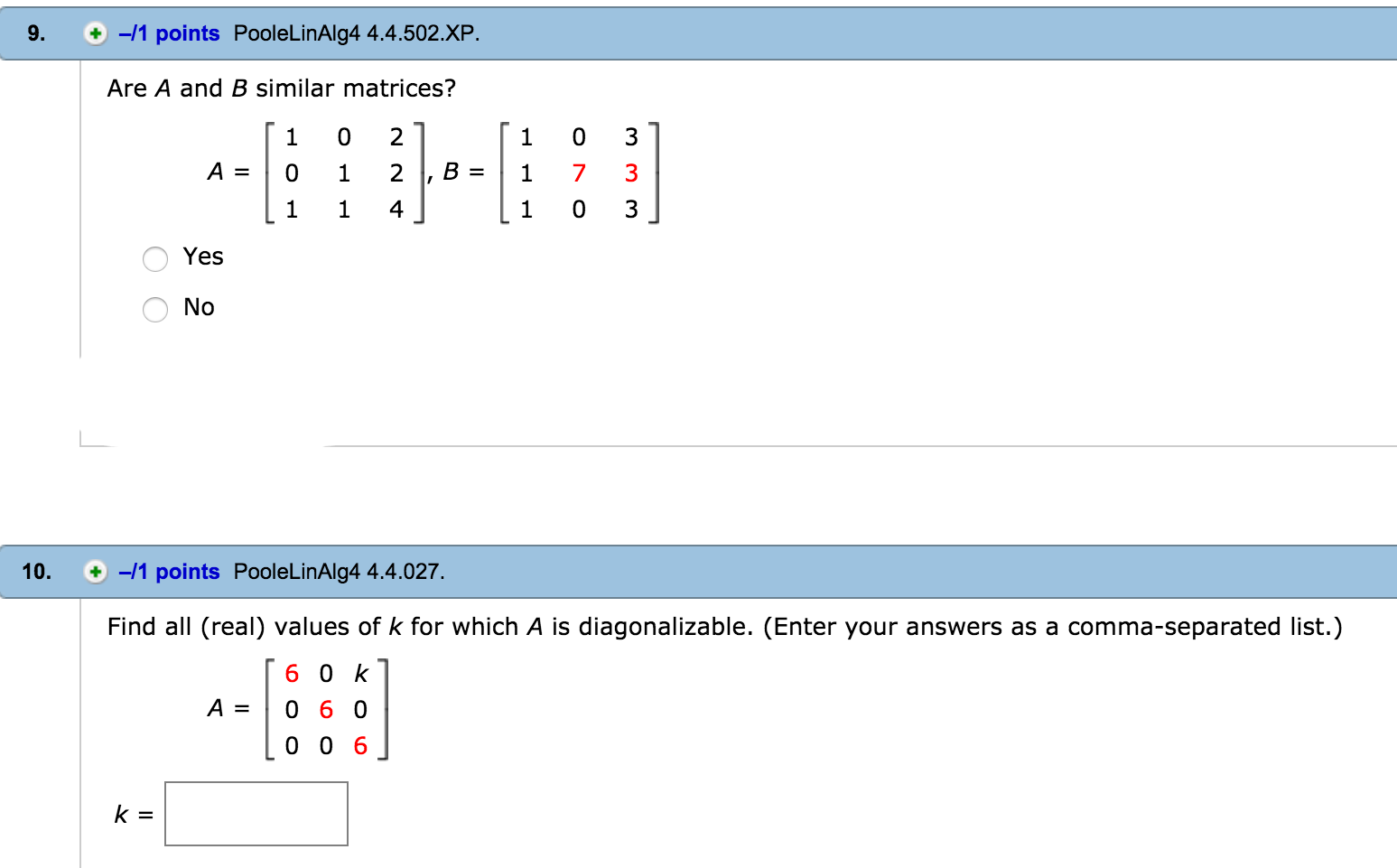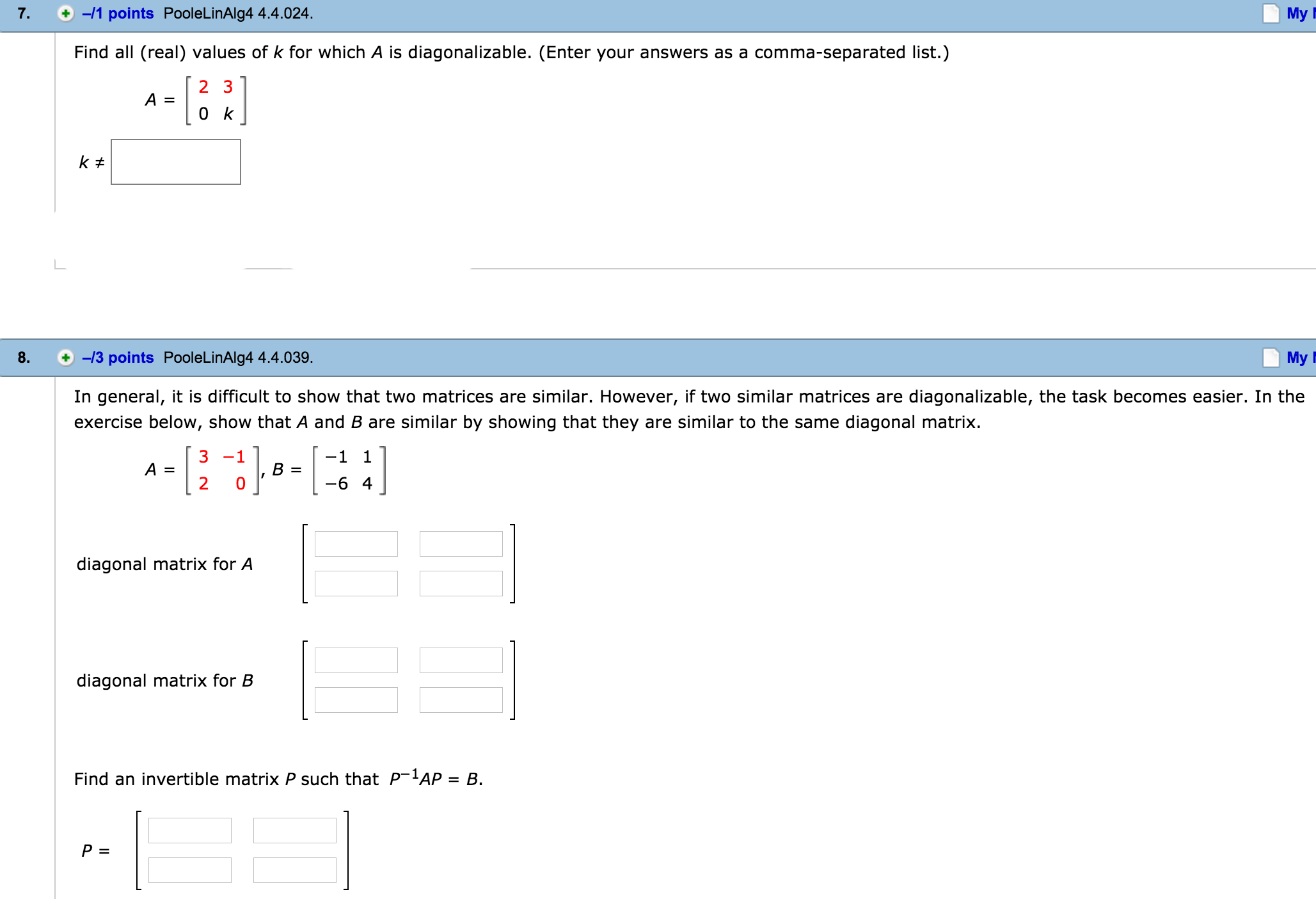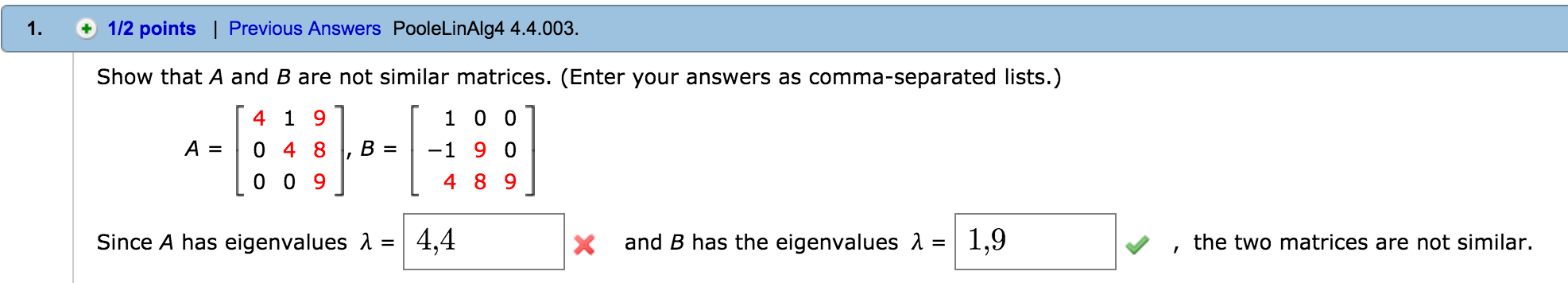 9. -/1 points PooleLinAlg4 4.4.502.XP. Are A and B similar matric...