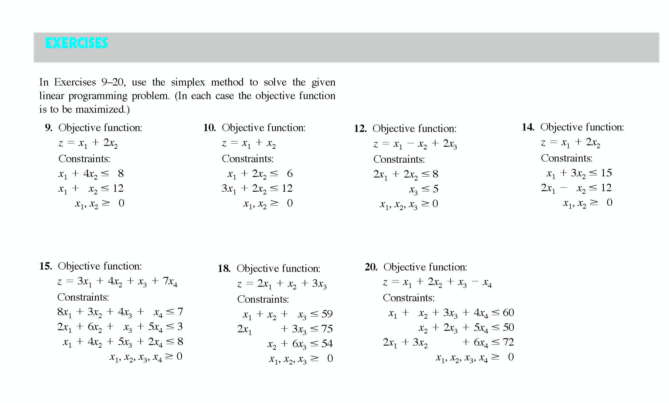 EXERCISES In Exercises 9-20. use the simplex method to solve the g...