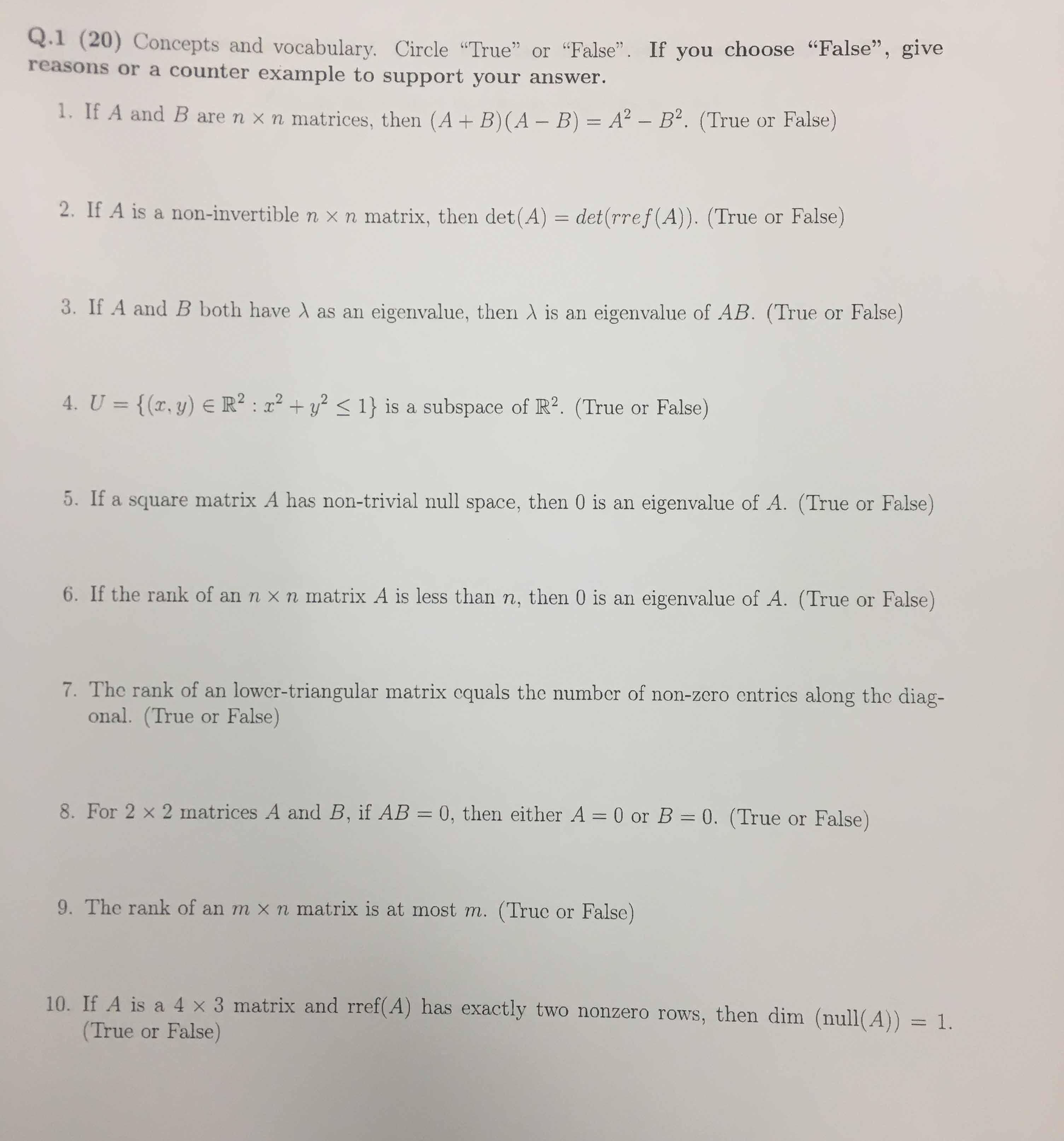 Q.1 (20) Concepts and vocabulary. Circle "True" or "...