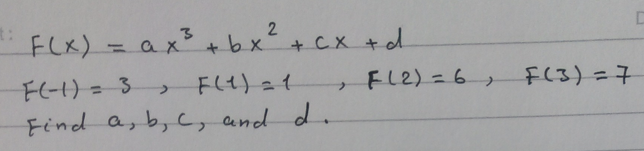 F(x) = =ax3 3 + b x + cx+d 2 FC-1) = 3 , F(1) = , F(2)=6, F(3) =...