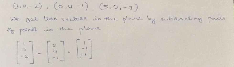 A plane contains points (1,3,-2), (0,4,-1), (5,0,-3). Describe the ...